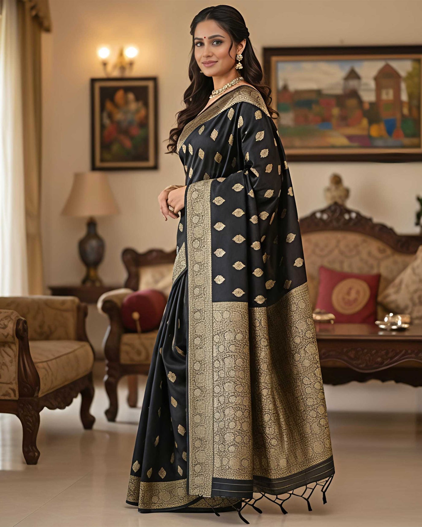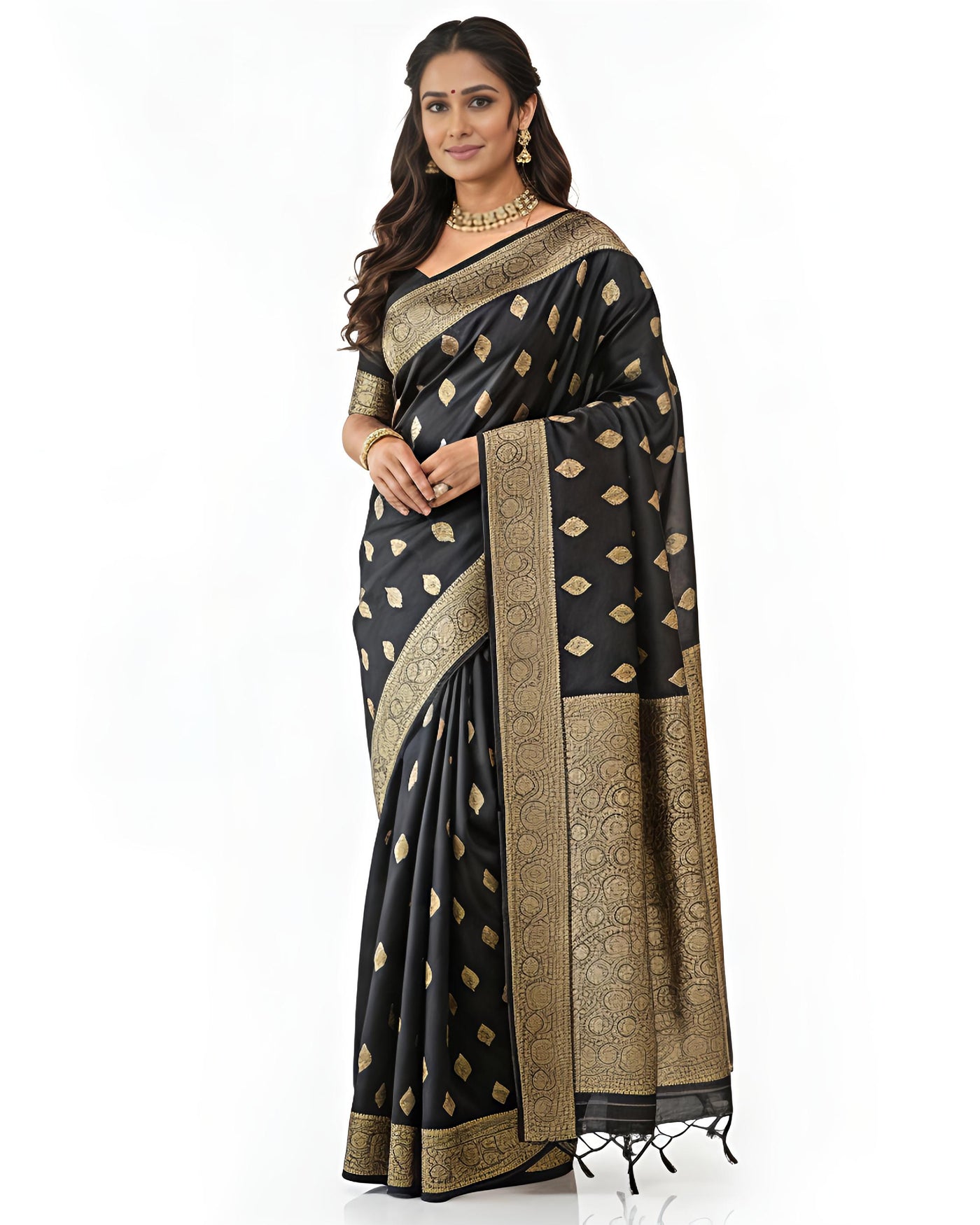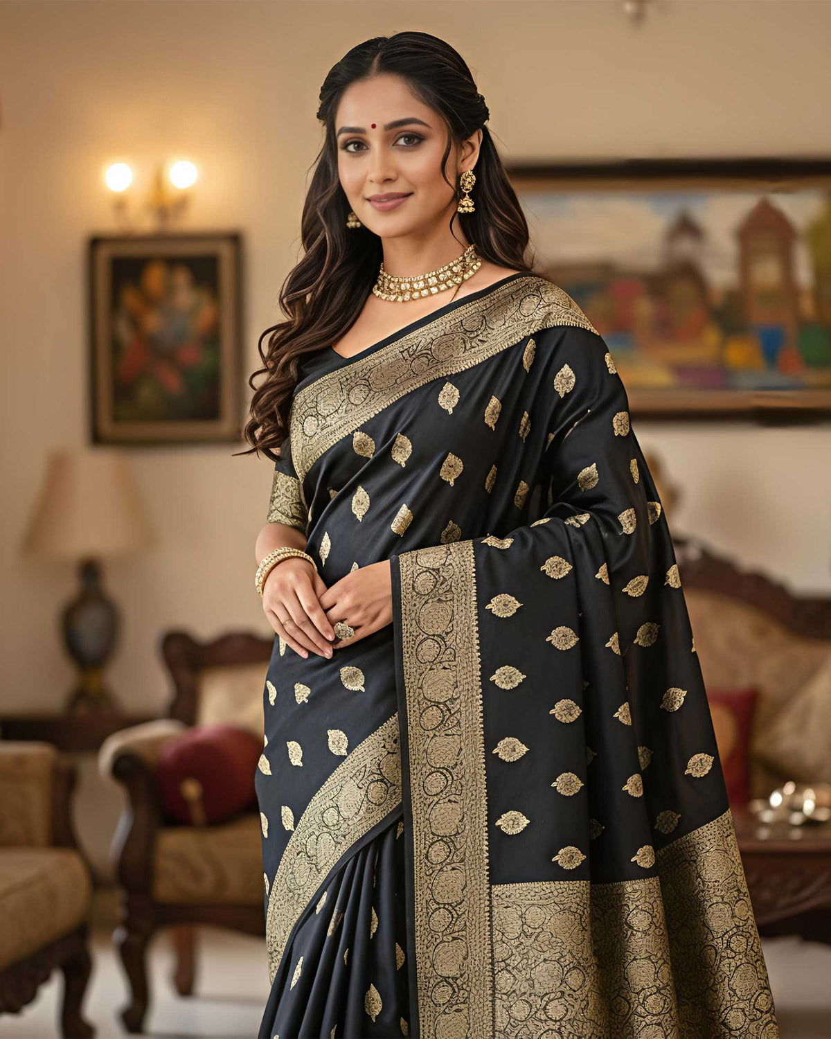 Black & Gold-Toned Zari Woven Banarasi Silk Blend Saree Includes Unstitched Blouse Piece