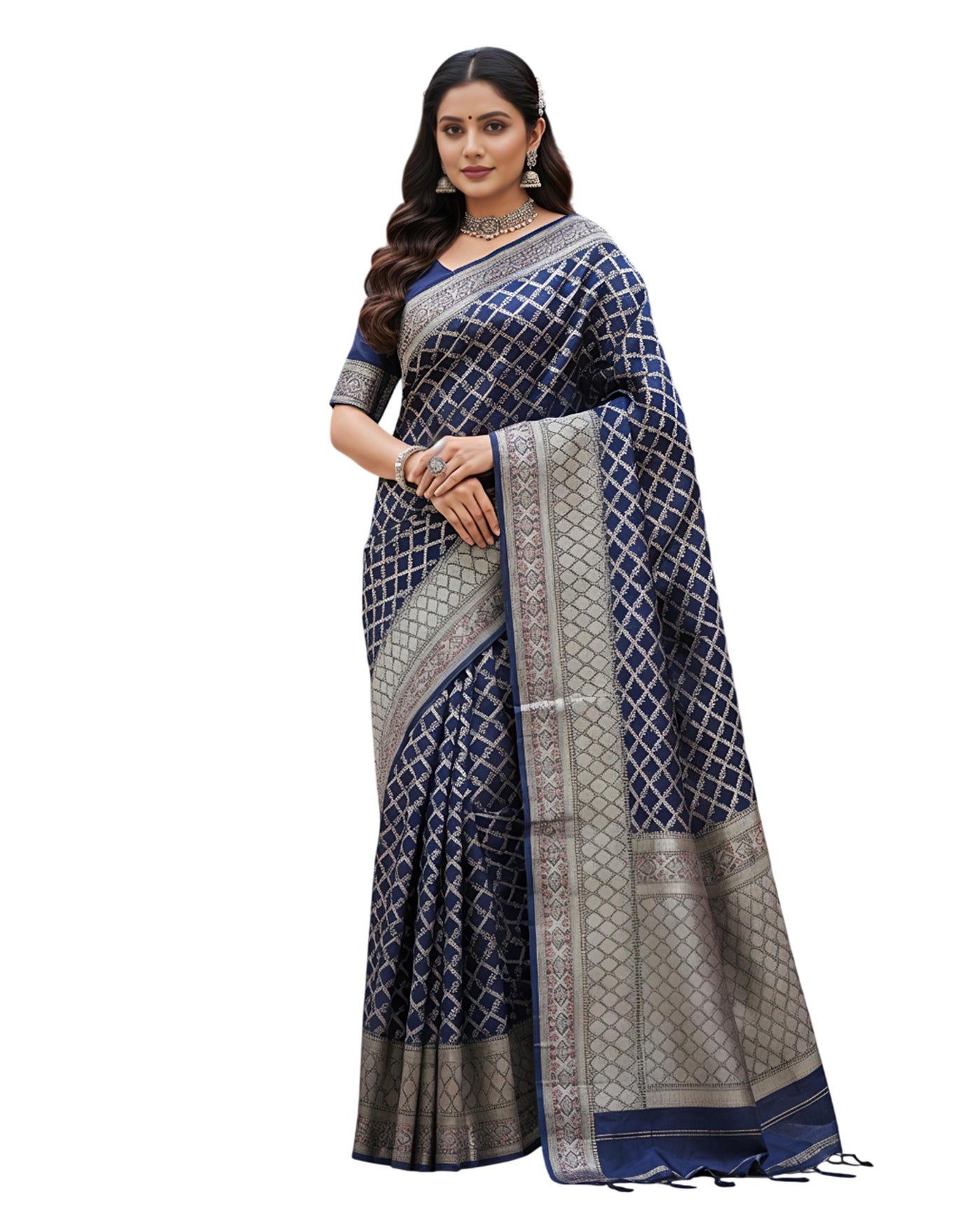 Exude timeless elegance with this Navy Blue Banarasi saree. The body is adorned with intricate silver-toned zari work in a geometric diamond pattern, while the heavy pallu and broad borders feature traditional motifs that add a touch of regal charm. Crafted from a premium silk blend, it offers a luxurious sheen and a graceful drape.