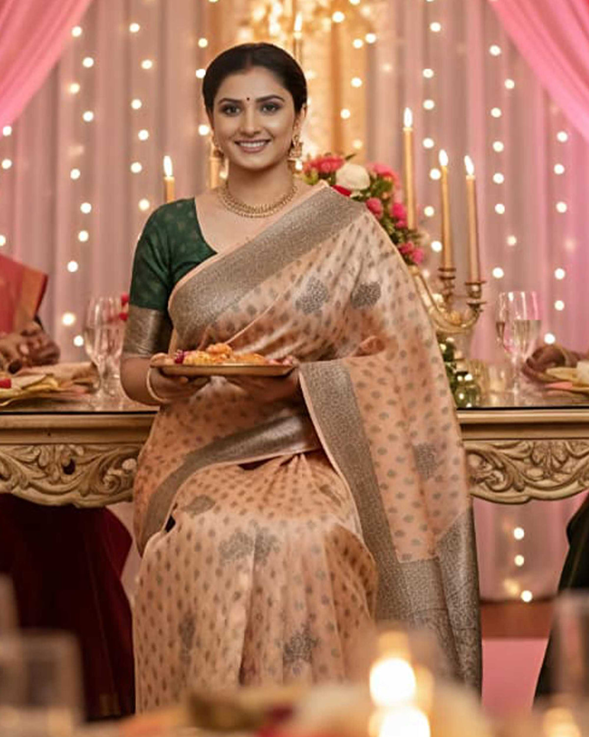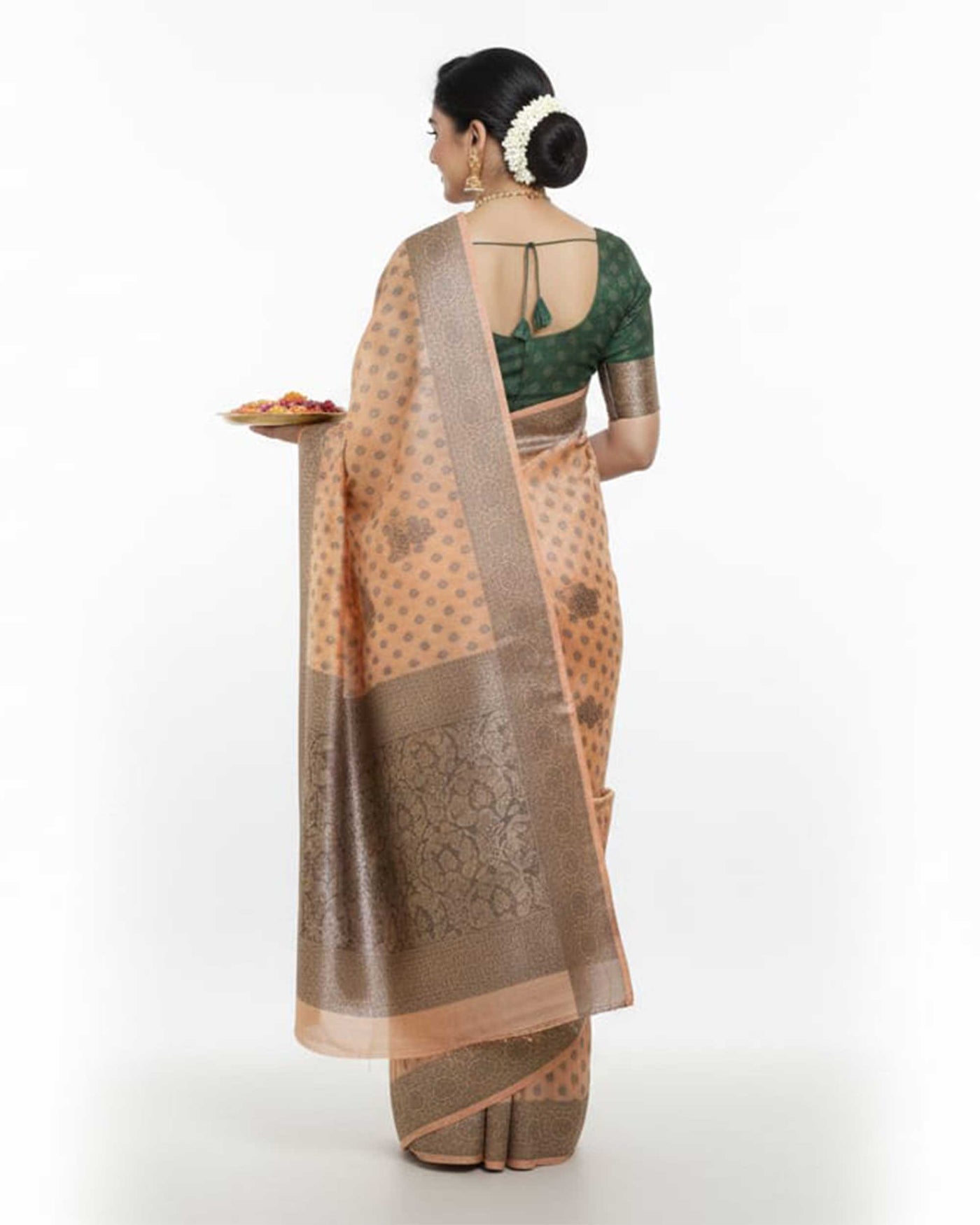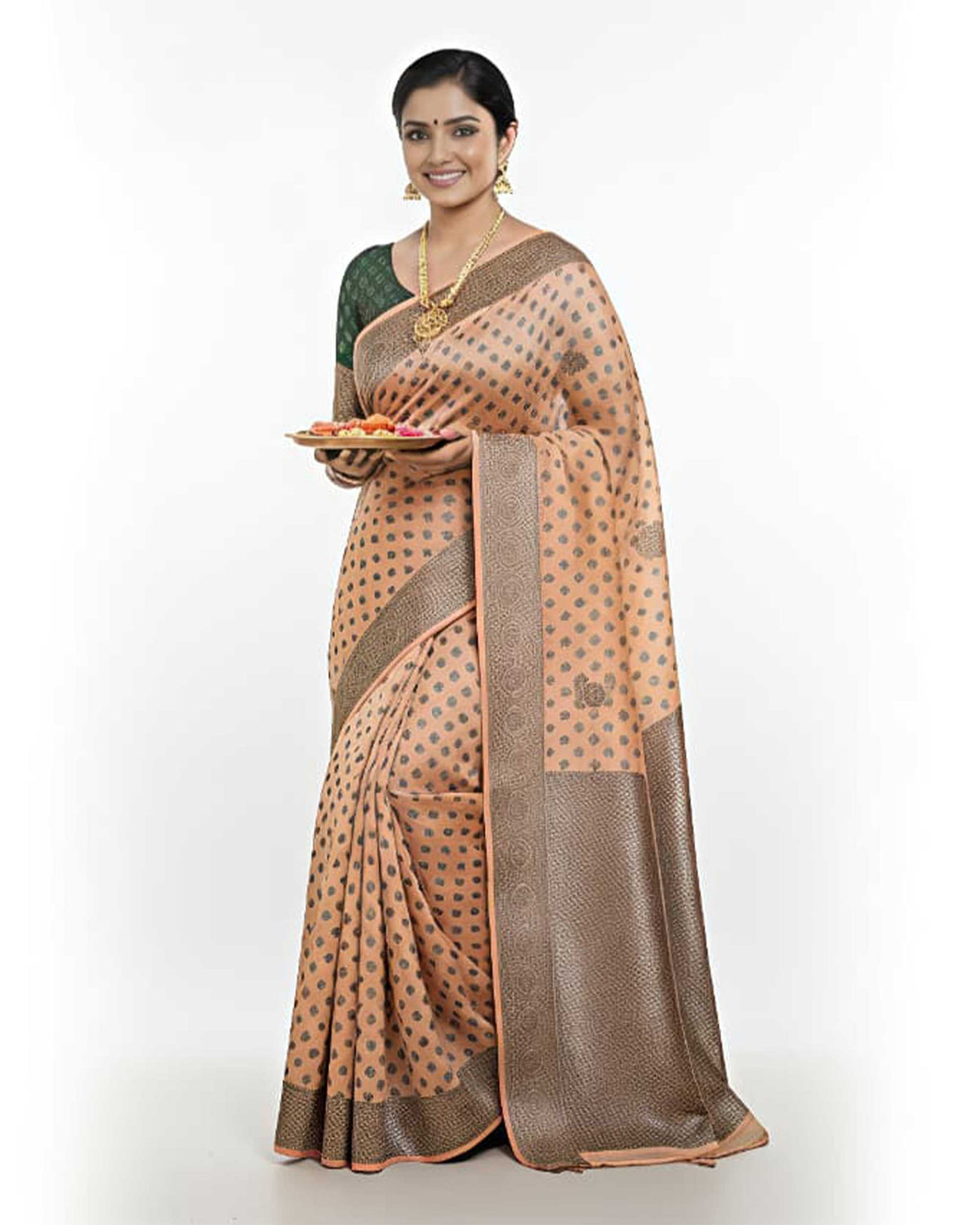 Elevate your ethnic wardrobe with this exquisite Banarasi saree, a perfect blend of timeless tradition and modern sophistication. Featuring a subtle peach base adorned with intricate charcoal-grey floral motifs (butis) and a broad, textured bronze-toned border, this saree is designed for the woman who appreciates understated luxury.