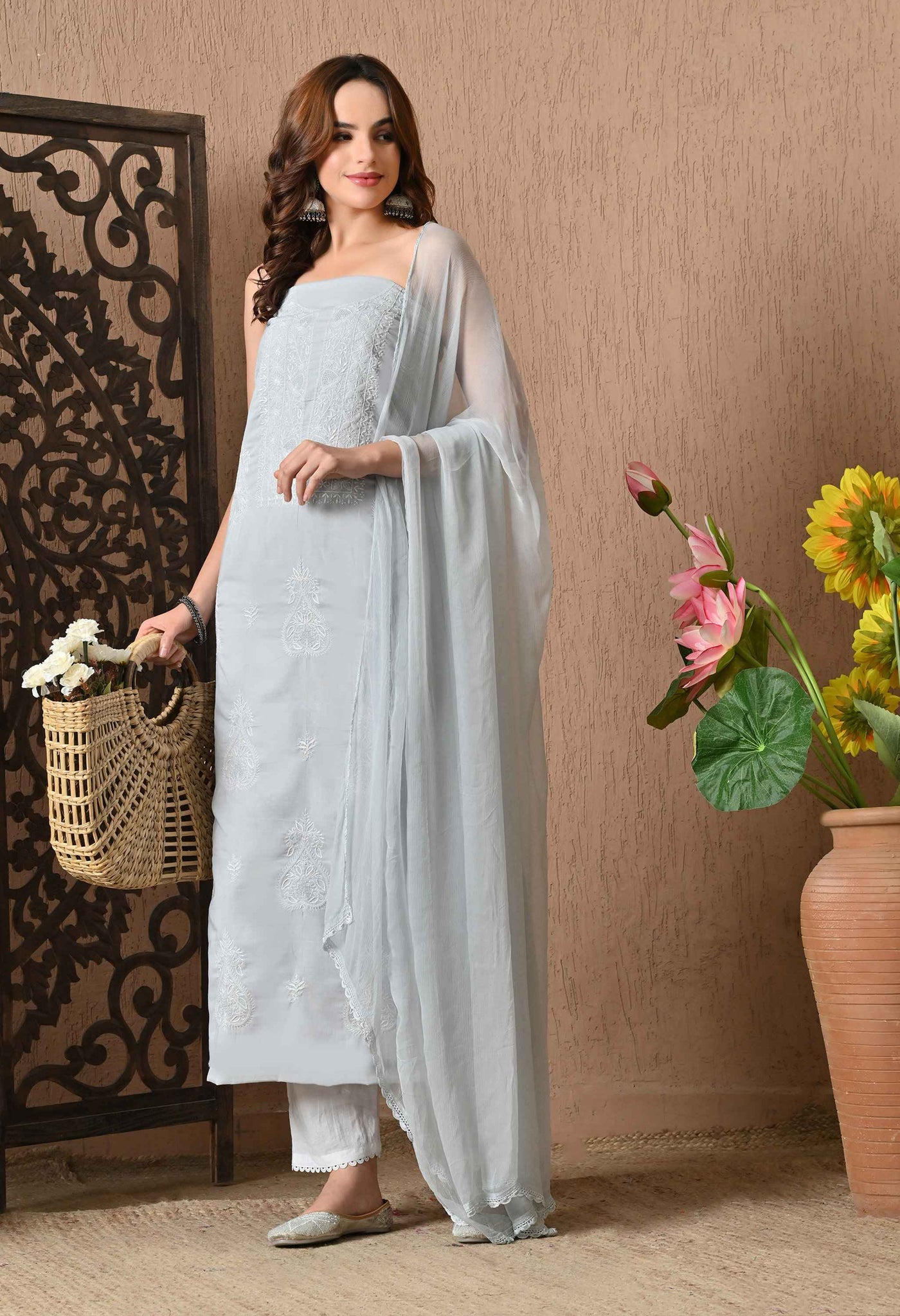 Welcome To Our The Weavers Shop By Raavi, Pure cotton Hand Embroidered Chikankari Salwar and suit. The entire fabric is hand embroidered with delicate Chikankari work on rich cotton fabric. There is heavy work on Kurta. this exquisite kurta set is a symphony of royal charm and intricate craftsmanship. This gray suit set for women, adorned with hand chikankari embroidery, exudes regal sophistication, Intricate floral and geometric motifs lend a timeless appeal, making this ensemble a perfect choice for festive celebrations and intimate gatherings.