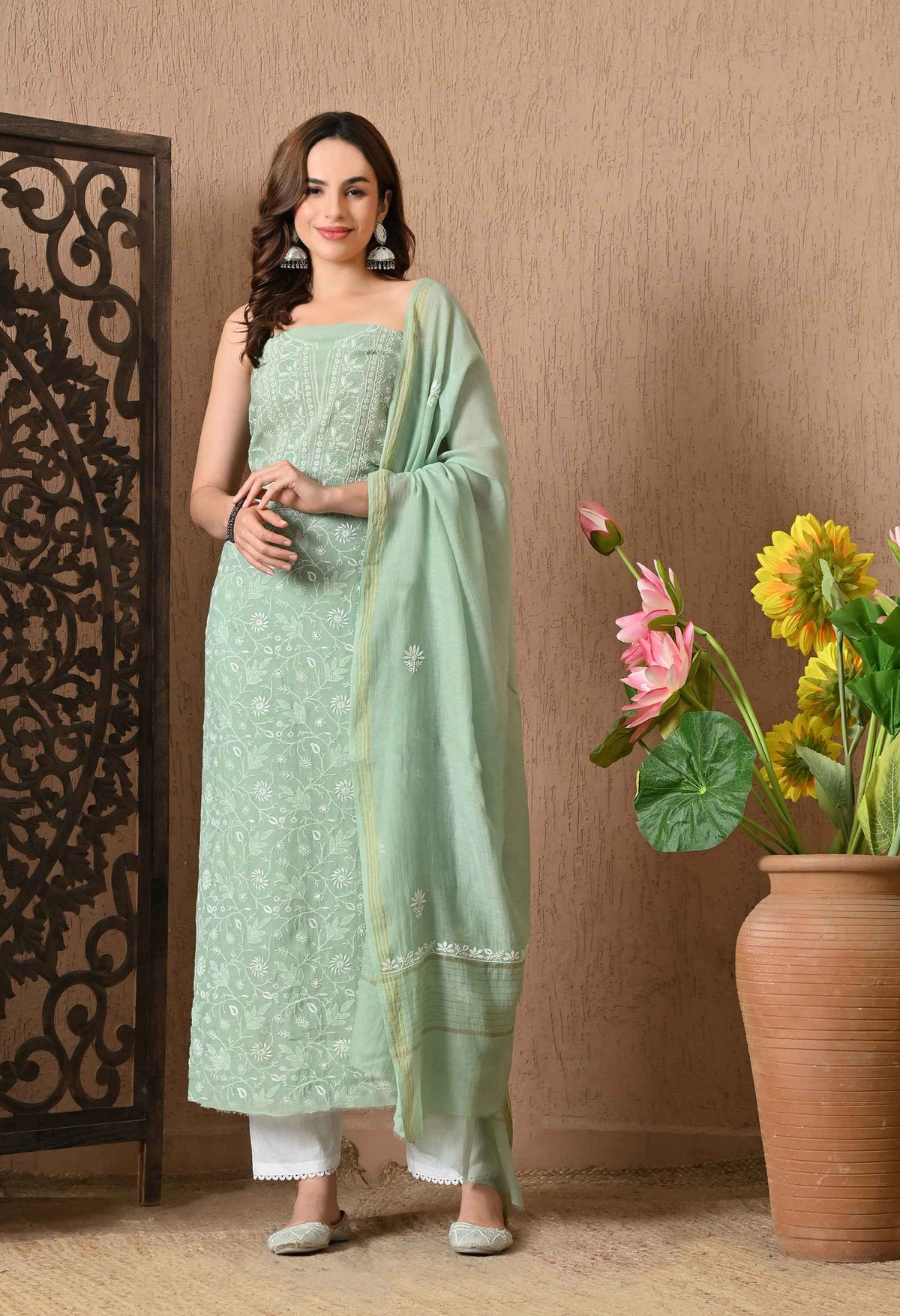 Welcome To our The Weavers Shop By Raavi, with this stunning light green Chanderi kurta dupatta set. This set is a perfect blend of classic grace and contemporary appeal, ideal for weddings, festivals, or any special occasion that demands an elegant, refined look. This Bijali work Jaali is a striking hand embroidered pattern that creates a delicate lattice design, giving the fabric a beautiful, intricate texture. The shimmering metallic threads used in the Bijali work bring the jaali motif to life, enhancing the overall design with a subtle yet eye catching glow. This set is perfect for those who appreciate fine craftsmanship and want to make a statement with their attire. Salwar and Suits best rakhi gifts for sister.