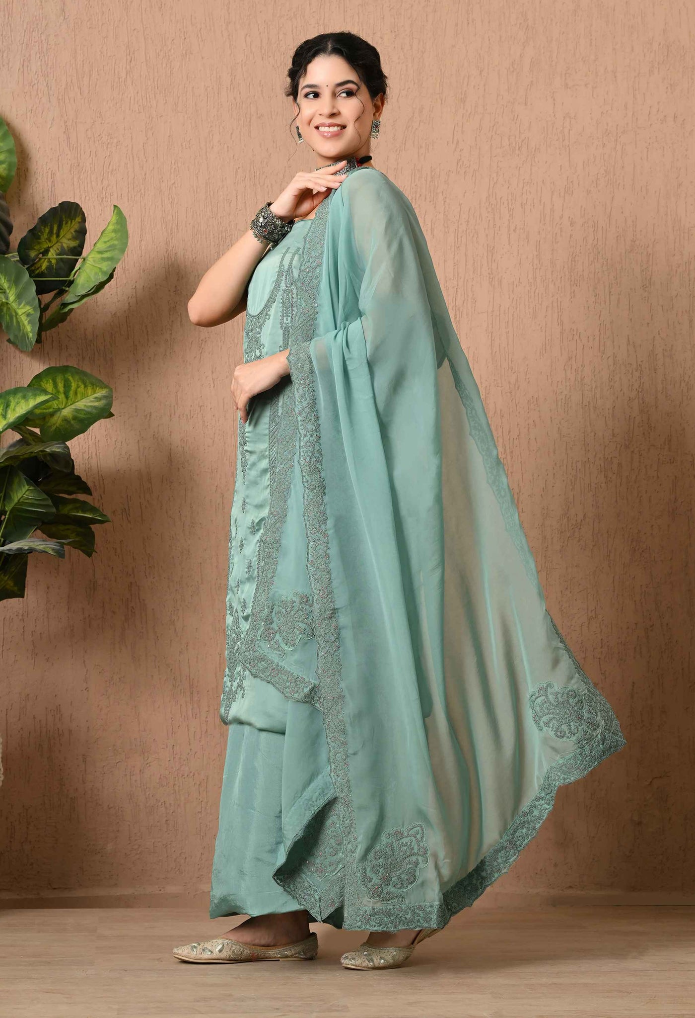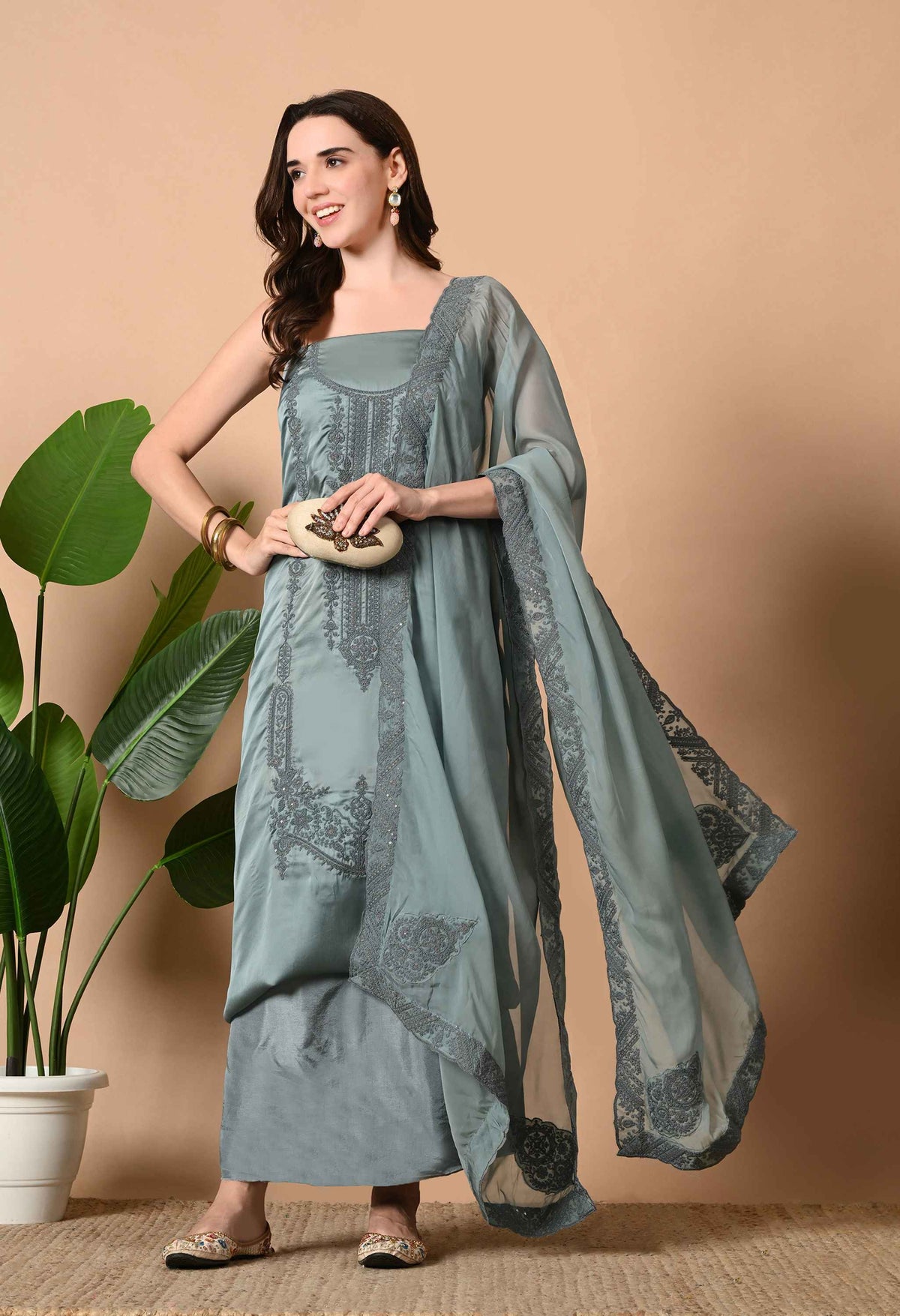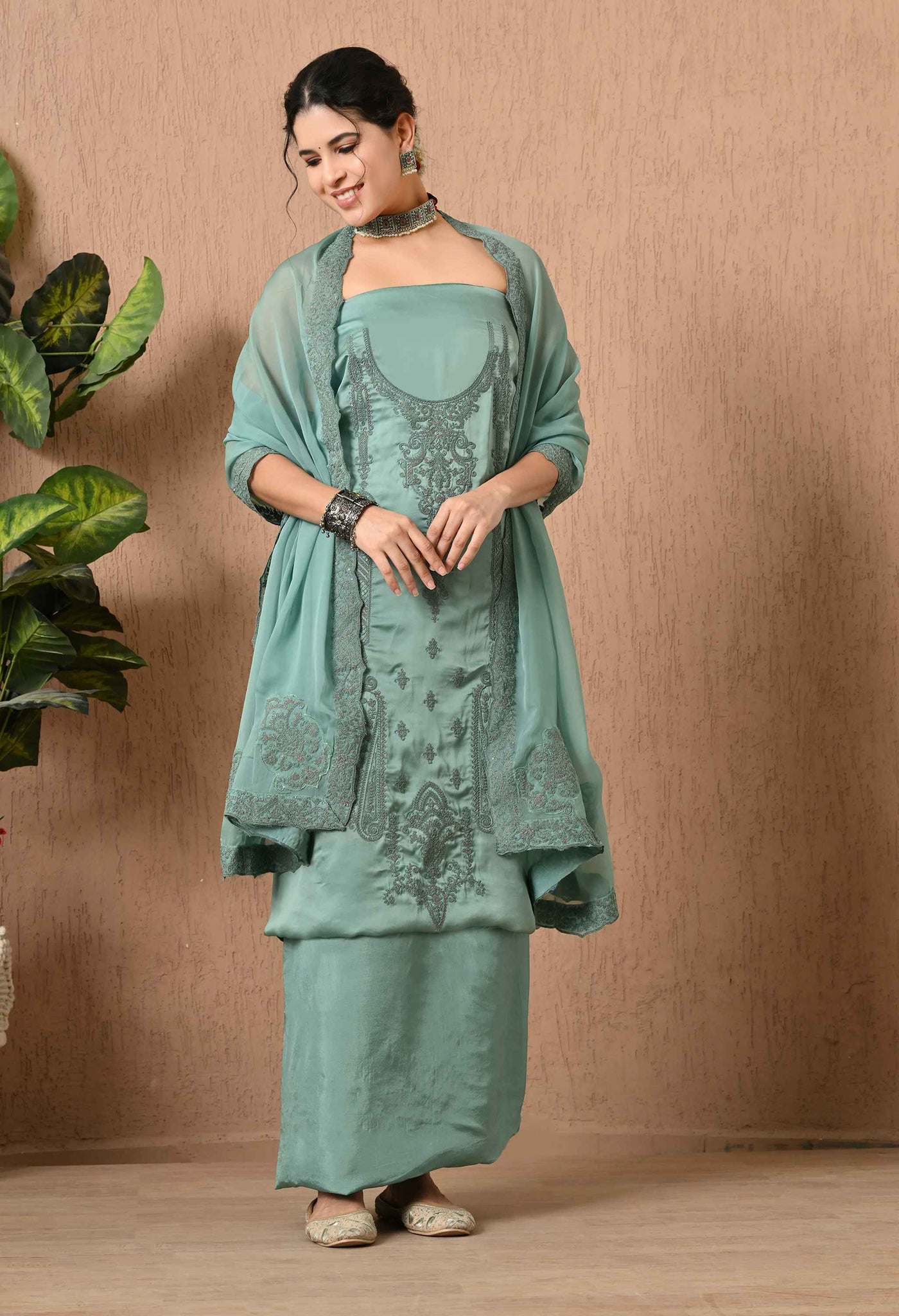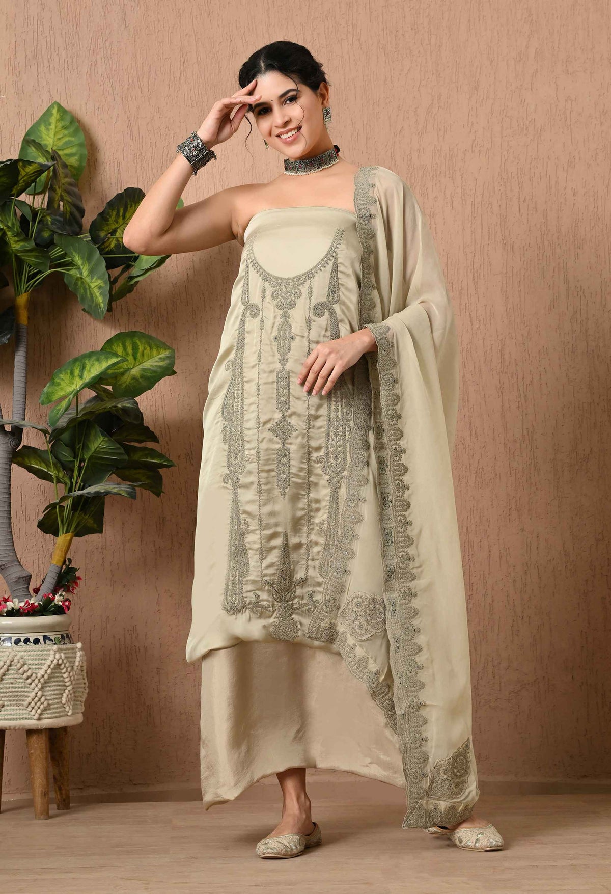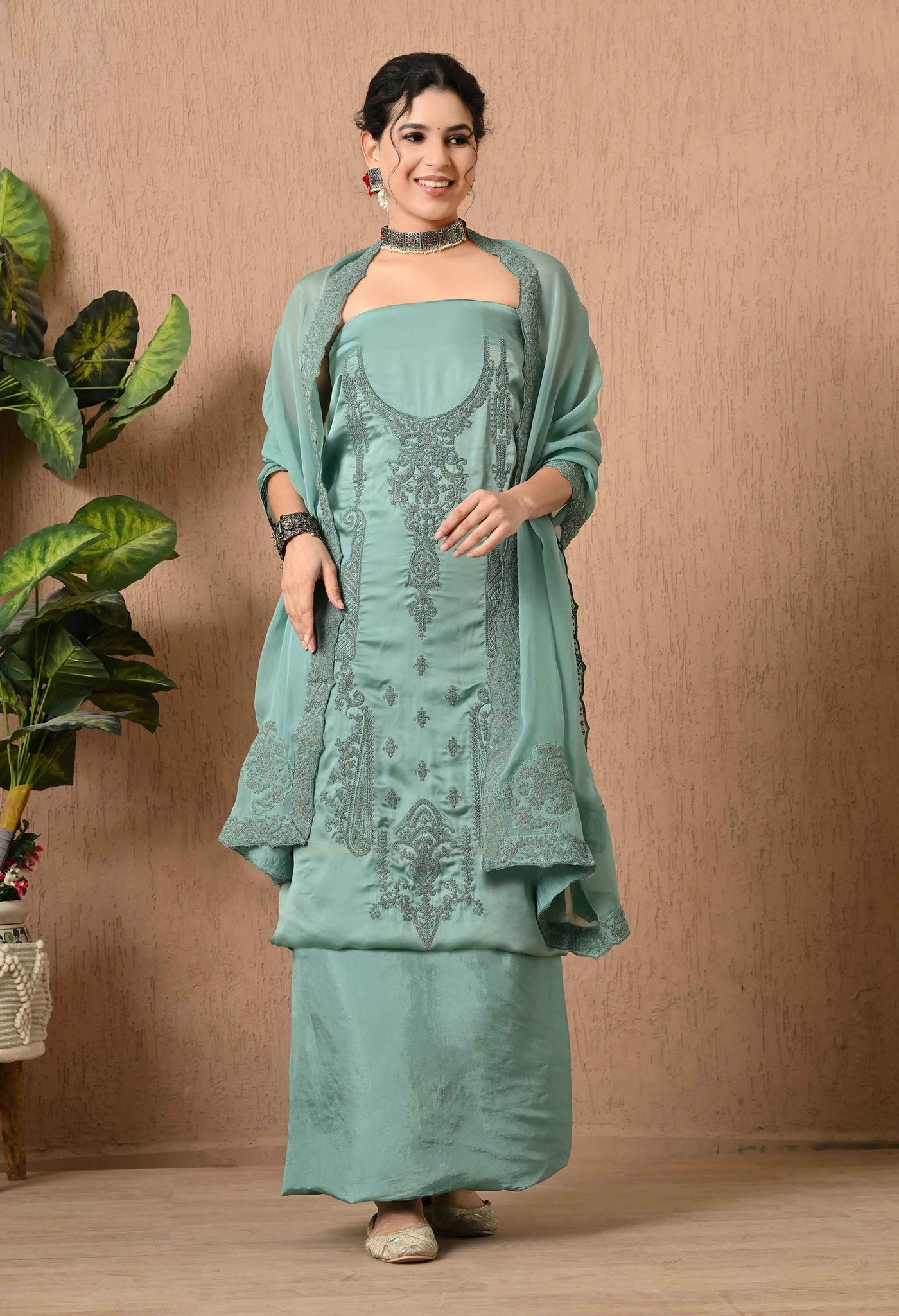 Welcome to our The weaver's shop By Raavi, This suit set combines the luxurious sheen of organza satin with intricate coding embroidery work, creating a refined look perfect for any occasion. The salwar suit for women offers a stunning blend of comfort and style, ideal for both formal and festive events. A perfect choice for a designer salwar kameez for women, this piece features an elegant women suits design that is perfect for women suits party wear or as a sophisticated option for women suits for wedding. Whether you're dressing for a women suits wedding or need women suits formal attire, this versatile outfit ensures you always look your best. A must-have addition to your women suits clothing collection.