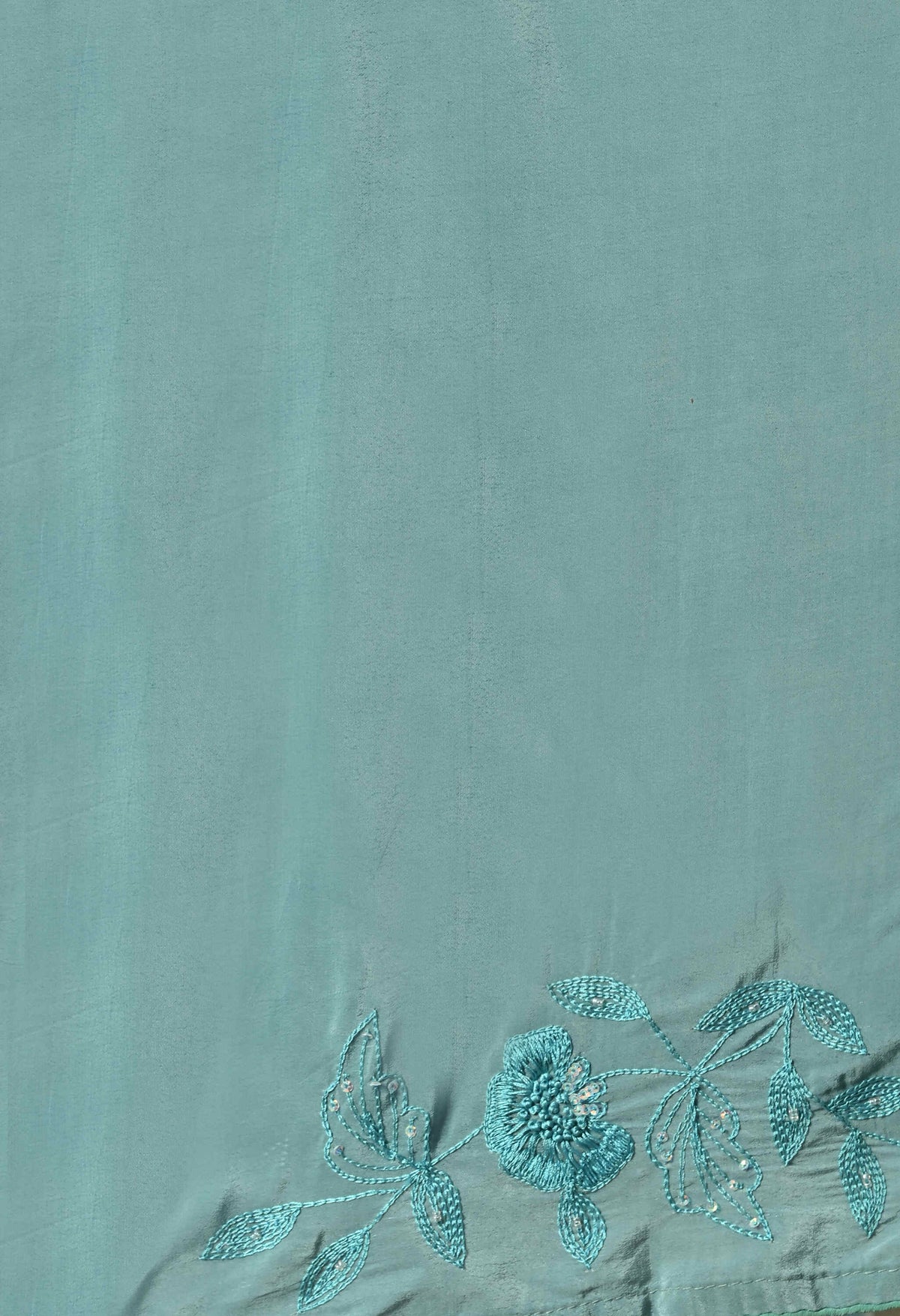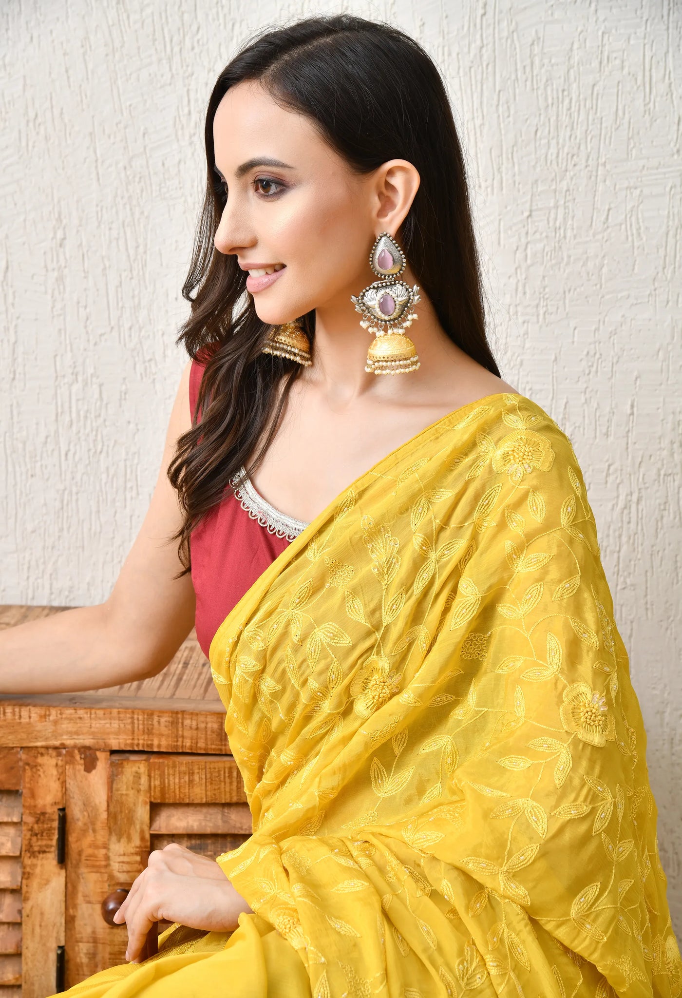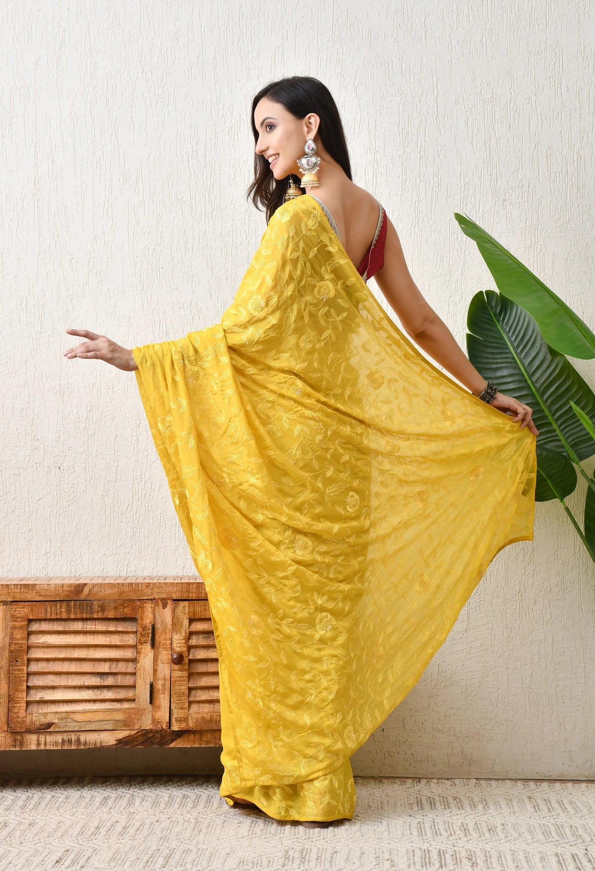 Welcome To Our The Weavers Shop By Raavi, With Chinon Chiffon Saree, a designer masterpiece that seamlessly combines traditional jaal and Aari work, Root embroidery, and the delicate elegance of French Knot detailing. This rare blend of heritage craftsmanship and contemporary design speaks of timeless grace. Crafted from pure Chinon chiffon, the saree features a soft, flowing drape that flatters every silhouette while offering breathable comfort perfect for long celebrations, weddings, receptions, and festive sarees.