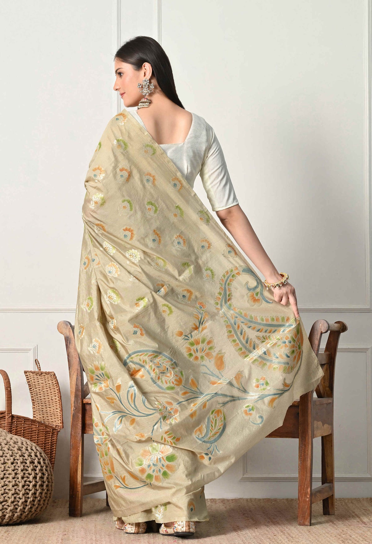 Adorned with intricate silver zari work, the saree features elaborate floral and geometric motifs that shimmer with every movement, creating a perfect contrast against the soft base. Whether it’s a wedding, festive gathering, or a grand celebration, this saree makes a statement of timeless charm.