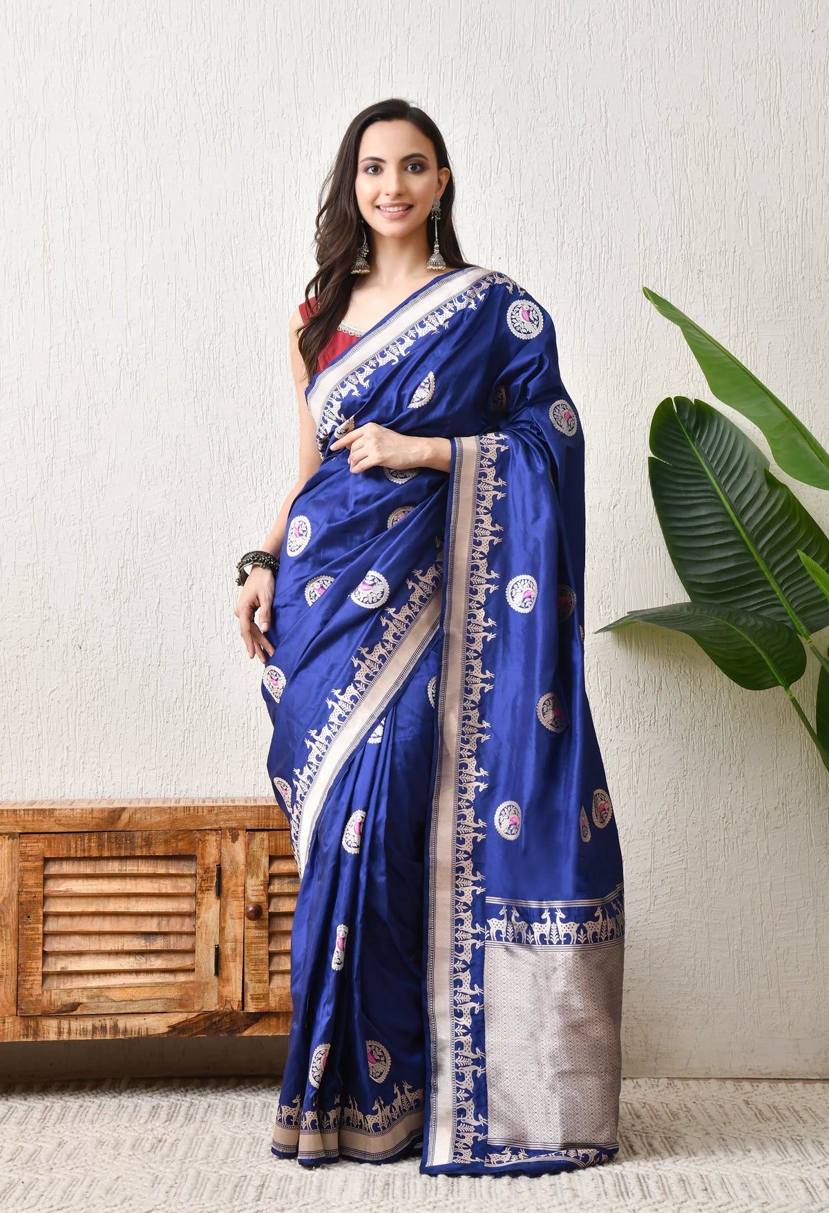 Crafted from the finest Katan silk, once adorned by queens and nobility, this saree is a statement of timeless beauty and cultural richness.