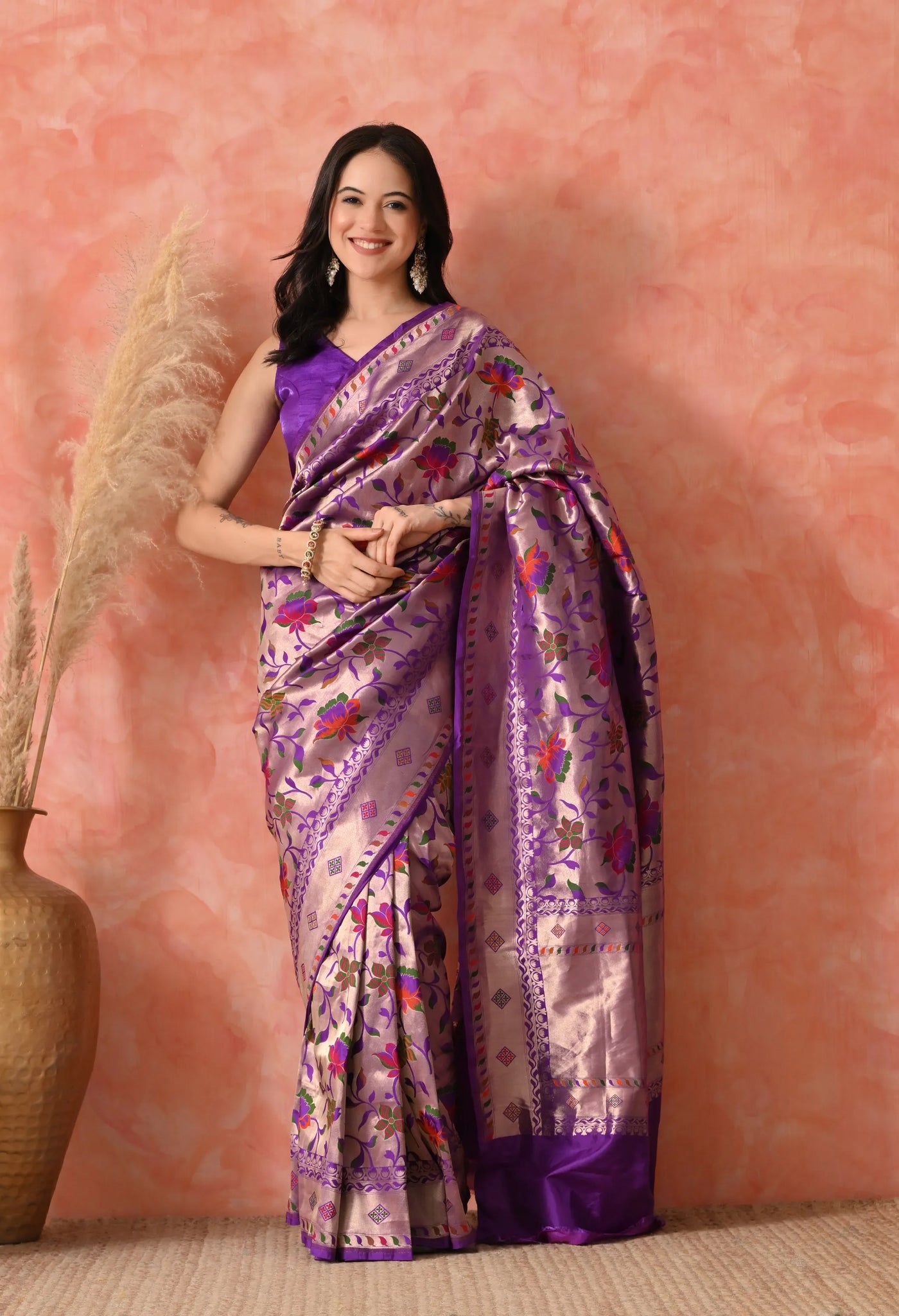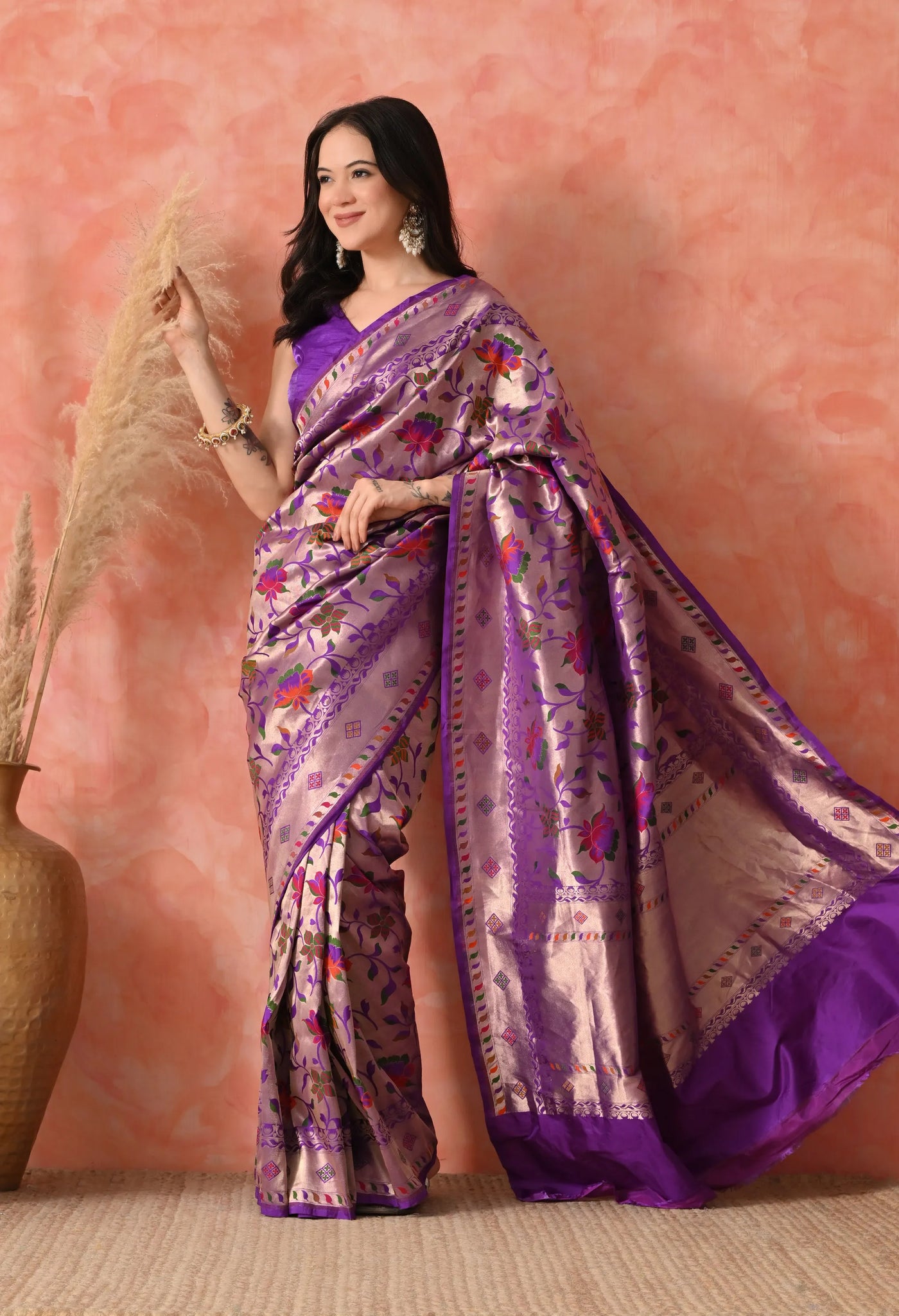 Crafted from the finest Katan silk, once adorned by queens and nobility, this saree is a statement of timeless beauty and cultural richness. The intricate floral motifs woven with shimmering double Zari threads bring forth a majestic charm, making it the perfect attire for weddings, grand celebrations, and special occasions.