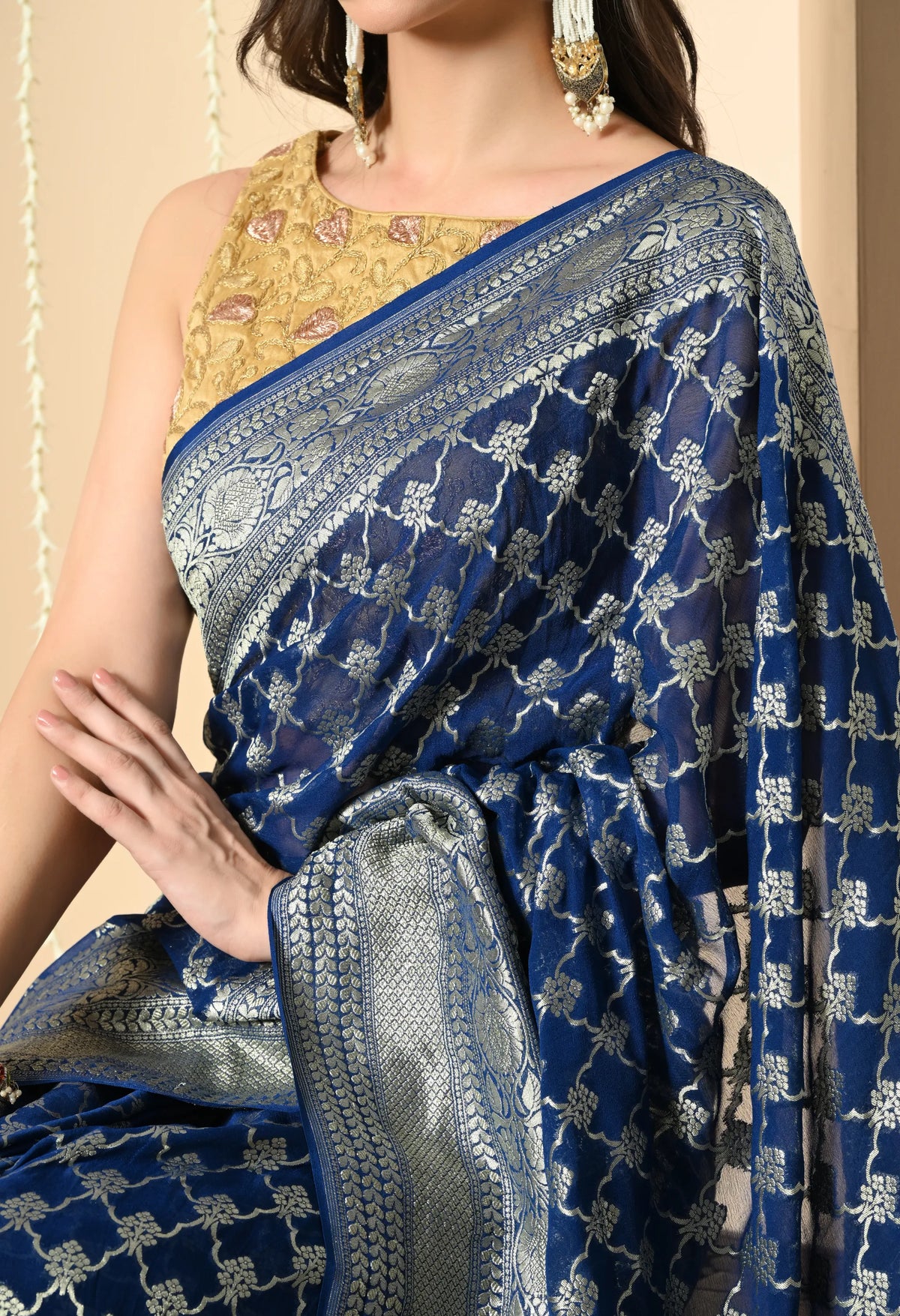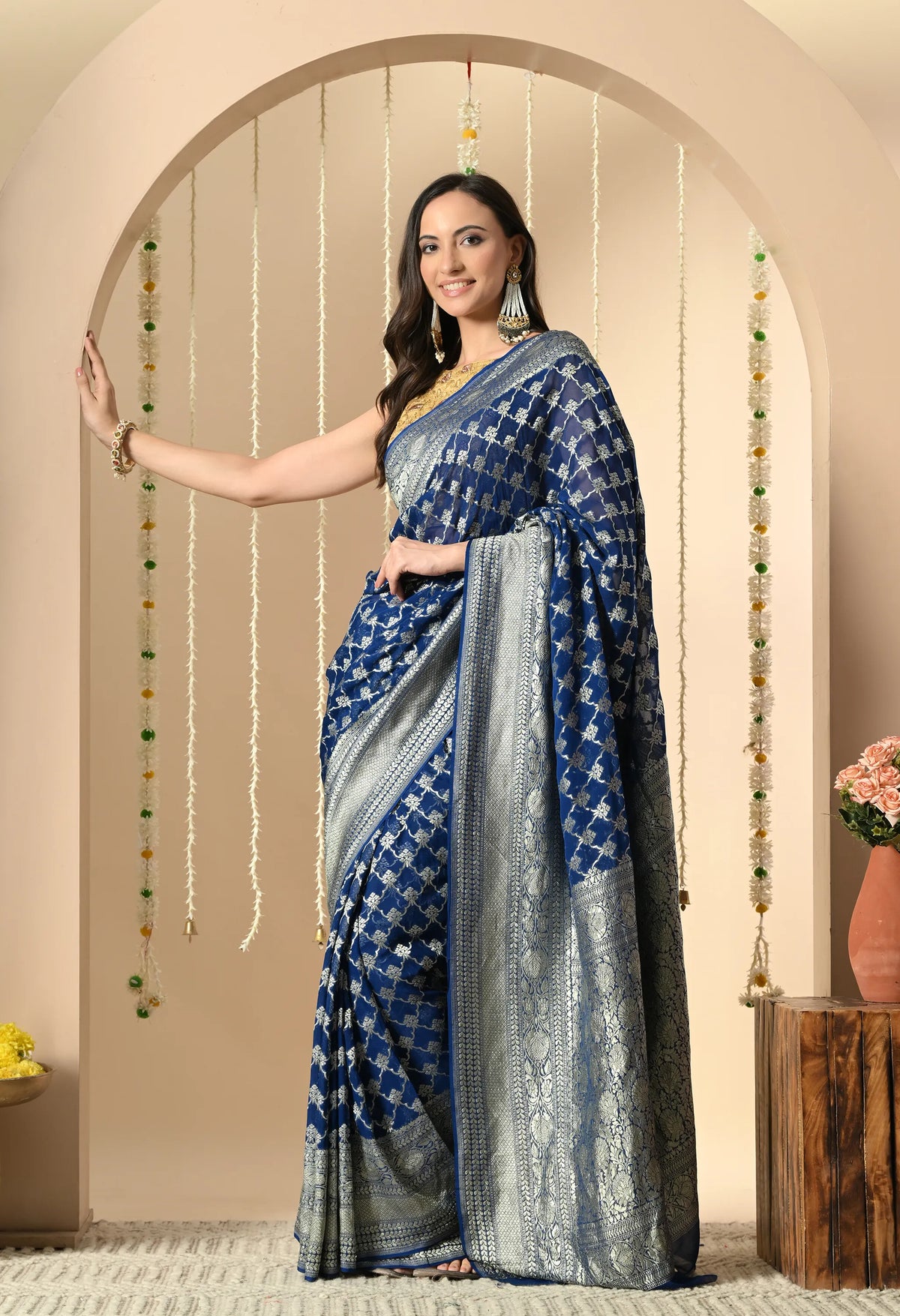 Welcome To Our The Weavers Shop By Raavi, Tradition with our Khadi Pure Georgette Blue Saree adorned with Handwoven Zari Work, a perfect blend of artisanal craftsmanship and contemporary elegance. Made from soft, breathable Khadi blended with flowing Georgette, this saree offers a graceful drape and lightweight comfort ideal for weddings, festive celebrations, and formal events.