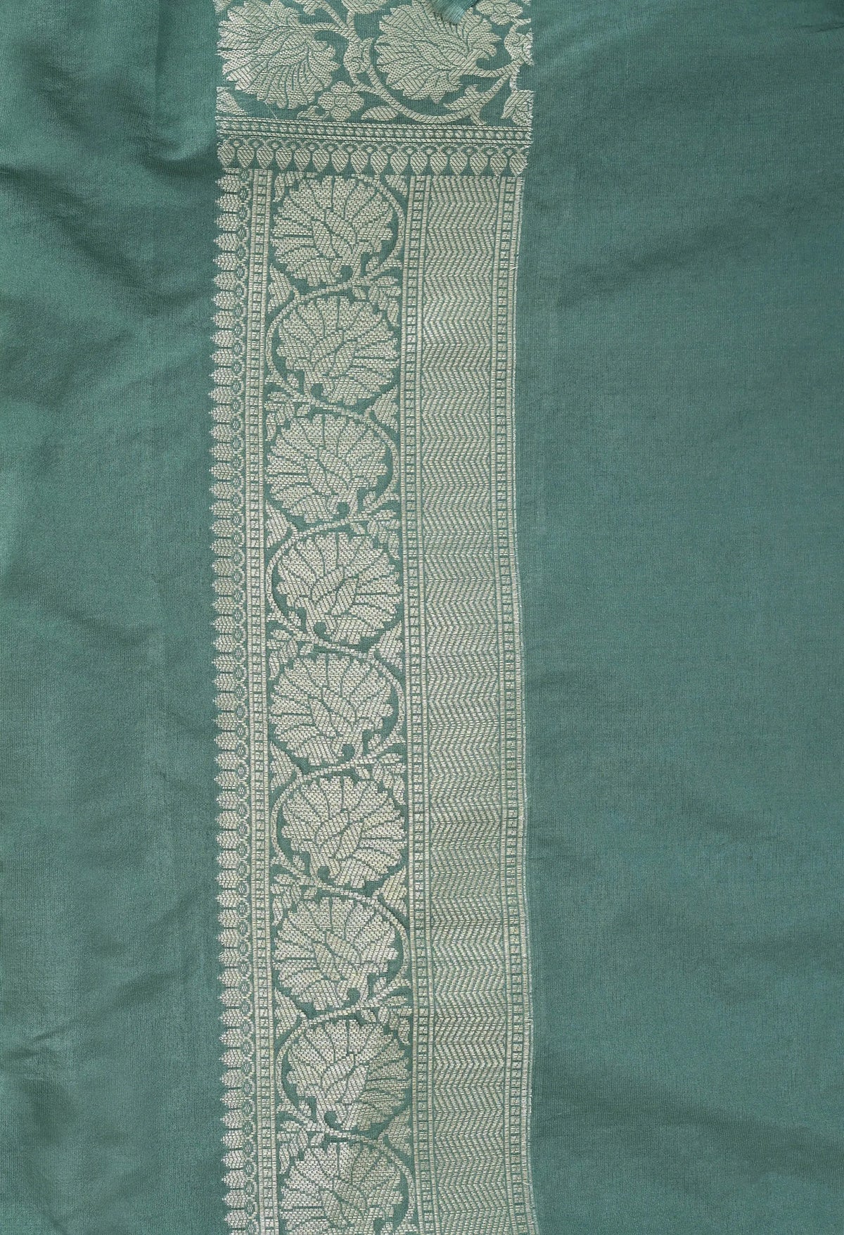 Adorned with intricate silver zari work, the saree features elaborate floral and geometric motifs that shimmer with every movement, creating a perfect contrast against the soft base. Whether it’s a wedding, festive gathering, or a grand celebration, this saree makes a statement of timeless charm.