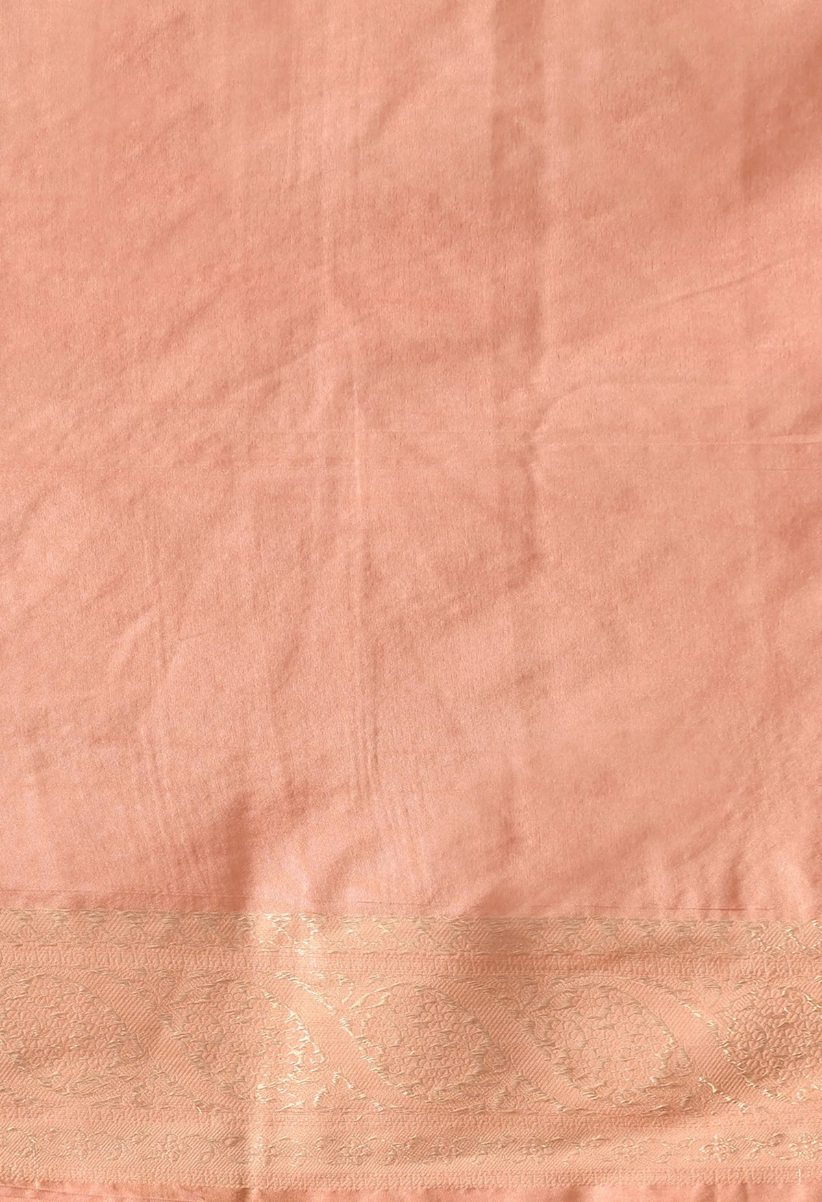 This saree is the intricate Tilphi Zari work a traditional weaving technique that combines fine threads of silver and gold zari to create elaborate motifs. The saree features floral and geometric patterns that shimmer gracefully with every movement, adding depth and richness to the fabric.