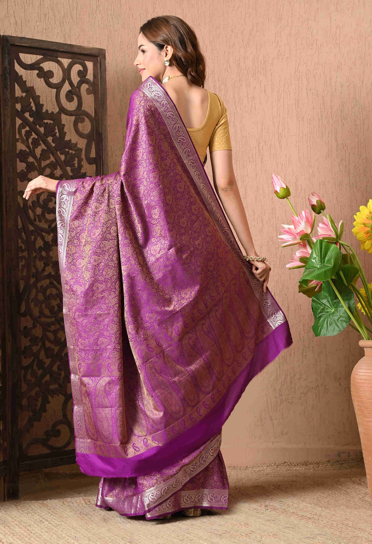 The rich purple hue symbolizes royalty, sophistication, and depth, making it a perfect choice for weddings, festivals, and grand celebrations.