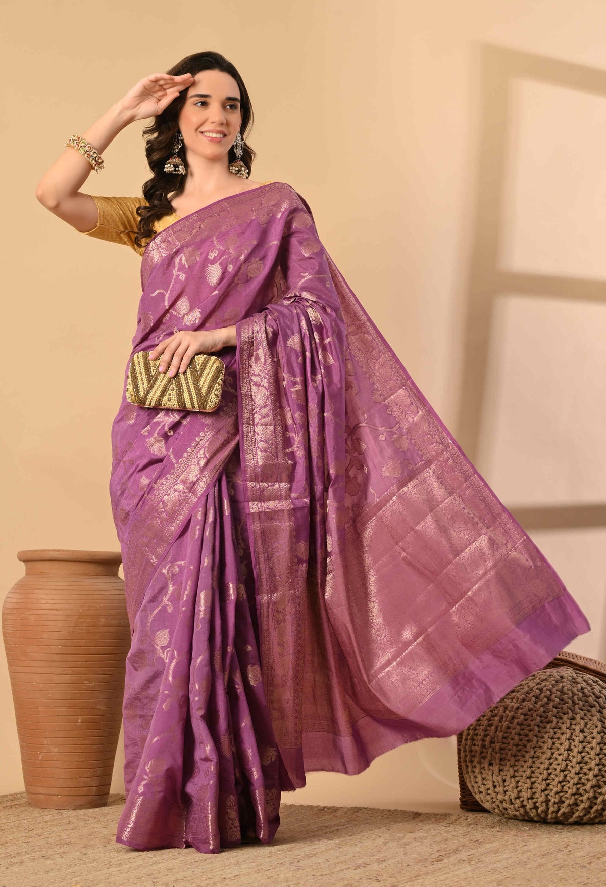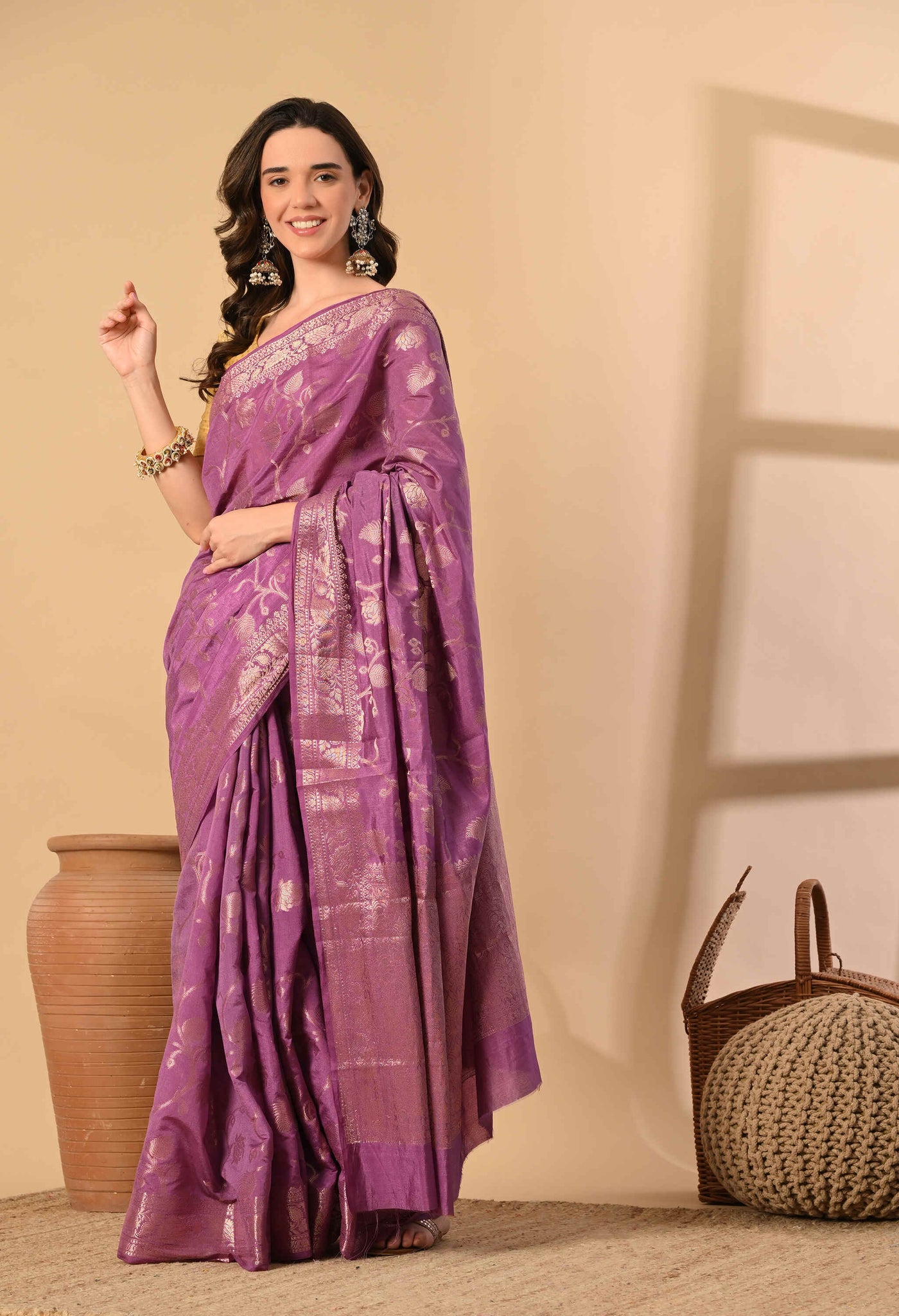 Welcome to The Weavers Shop by Raavi, With this Banarasi Silk Saree, a masterpiece of Indian craftsmanship. Made from premium silk, it offers a luxurious, smooth texture and a rich sheen that reflects elegance and sophistication. The saree is adorned with intricate Zari weave, featuring delicate gold and silver threads that enhance the overall charm, making it perfect for weddings, festive celebrations, and special occasions.