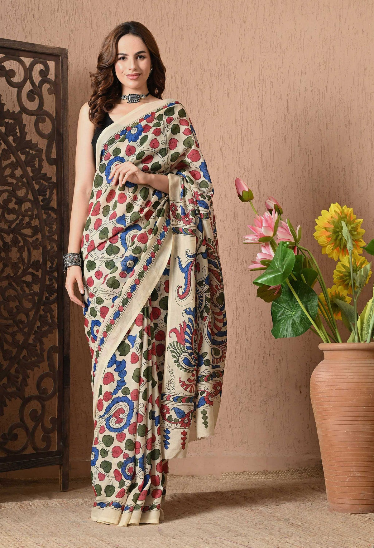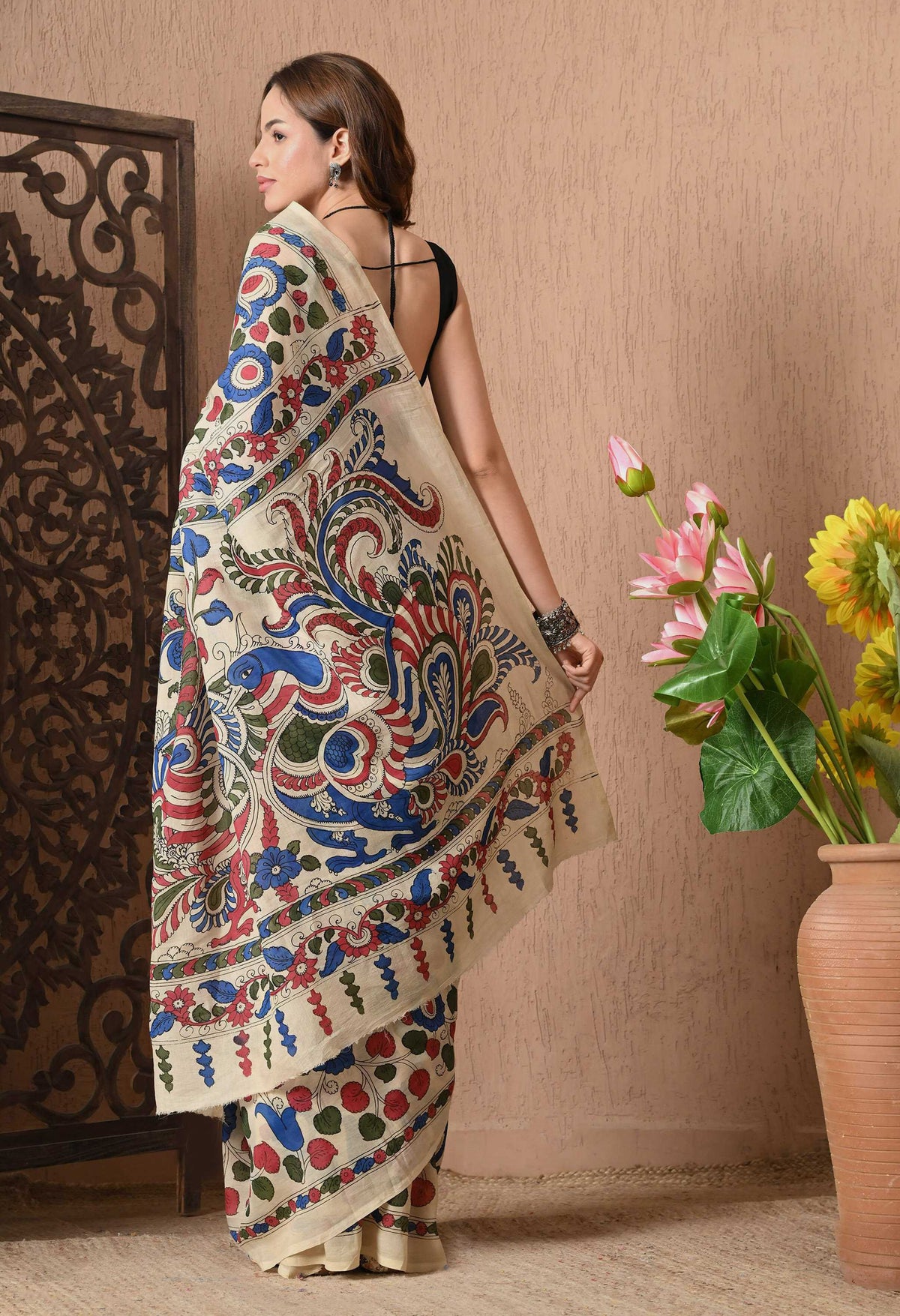 Welcome To Our The Weavers Shop by Raavi, with our Cotton Silk Saree, featuring a beautiful hand painted Kalamkari design in a sophisticated beige hue. This masterpiece blends the rich heritage of Indian artistry with contemporary elegance, making it perfect for both festive occasions and elegant gatherings. This saree drapes gracefully, offering a soft, flowing texture that feels as divine as it looks. The intricate Kalamkari motifs, ultra-carefully hand-painted by skilled artisans, showcase vibrant natural colors and traditional themes rooted in mythology and nature.