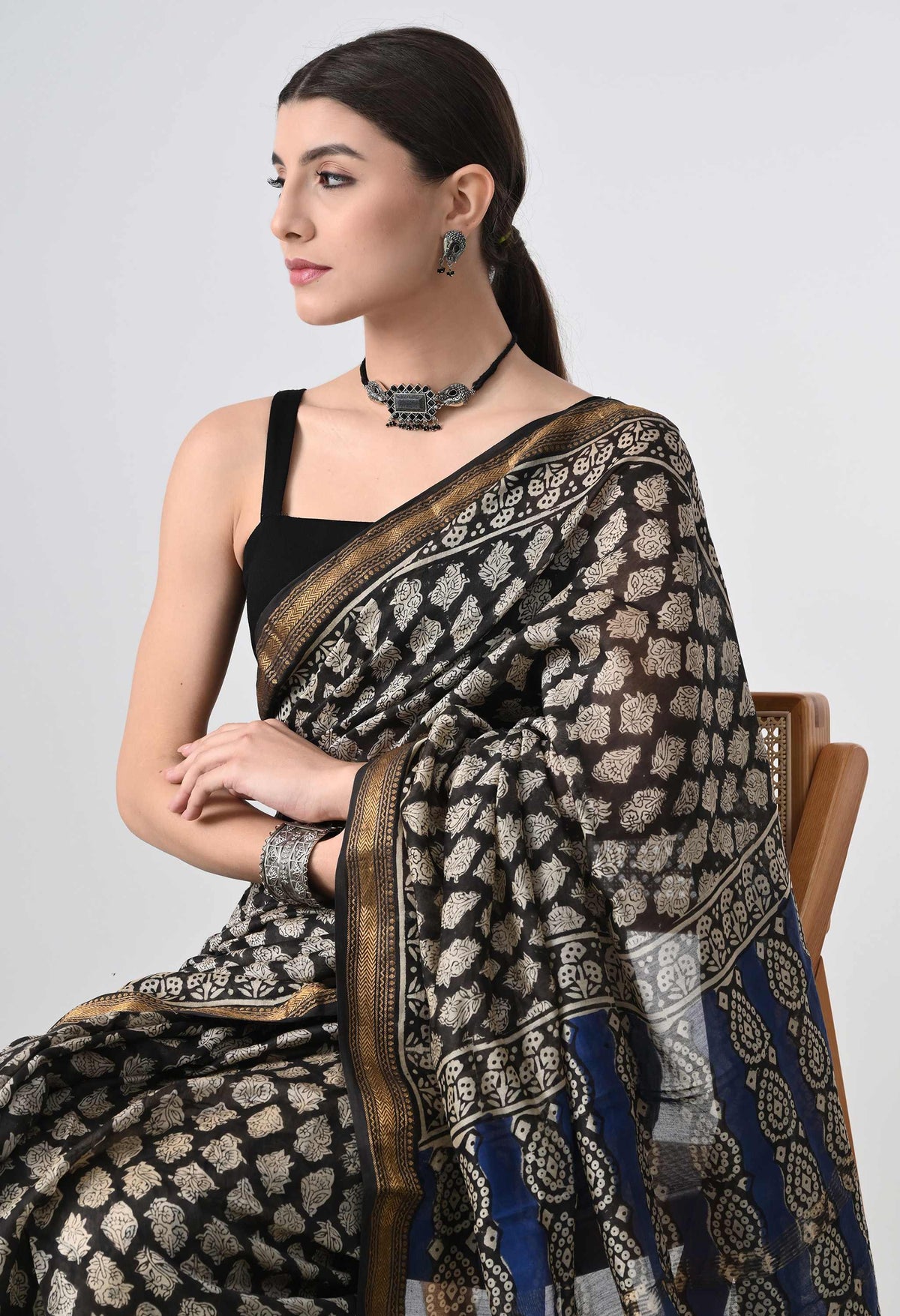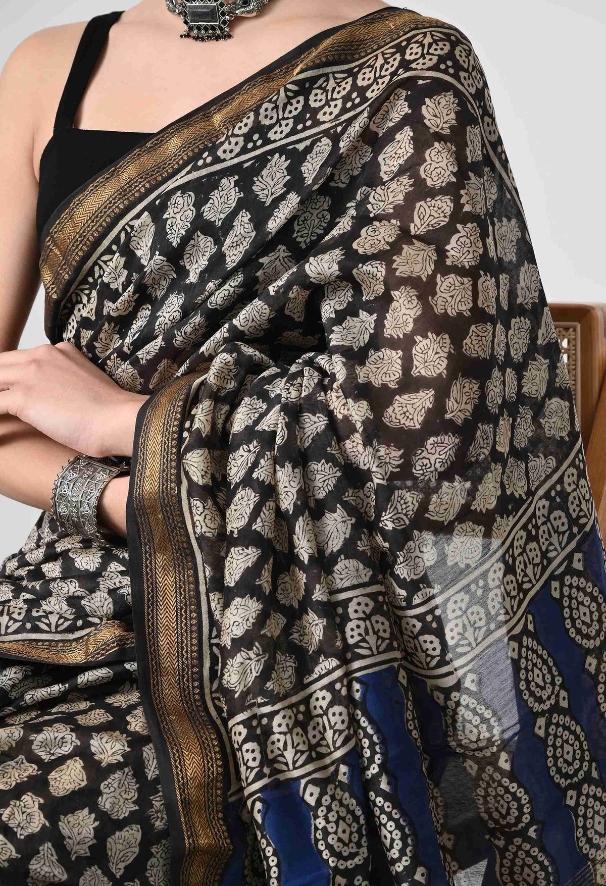 Welcome To Our The Weavers Shop By Raavi, upgrade your style with our Hand Block Printed Saree, boasting a Indigo body with delicate Handblock Prints. Crafted from luxurious Silk cotton this saree effortlessly combines Traditional Artistry with Modern Grace, creating a statement piece for any occasion. Bring home a piece of modern Indian aesthetic, reflecting Block Print crafts. Explore more artisanal finds from our Saree range.
