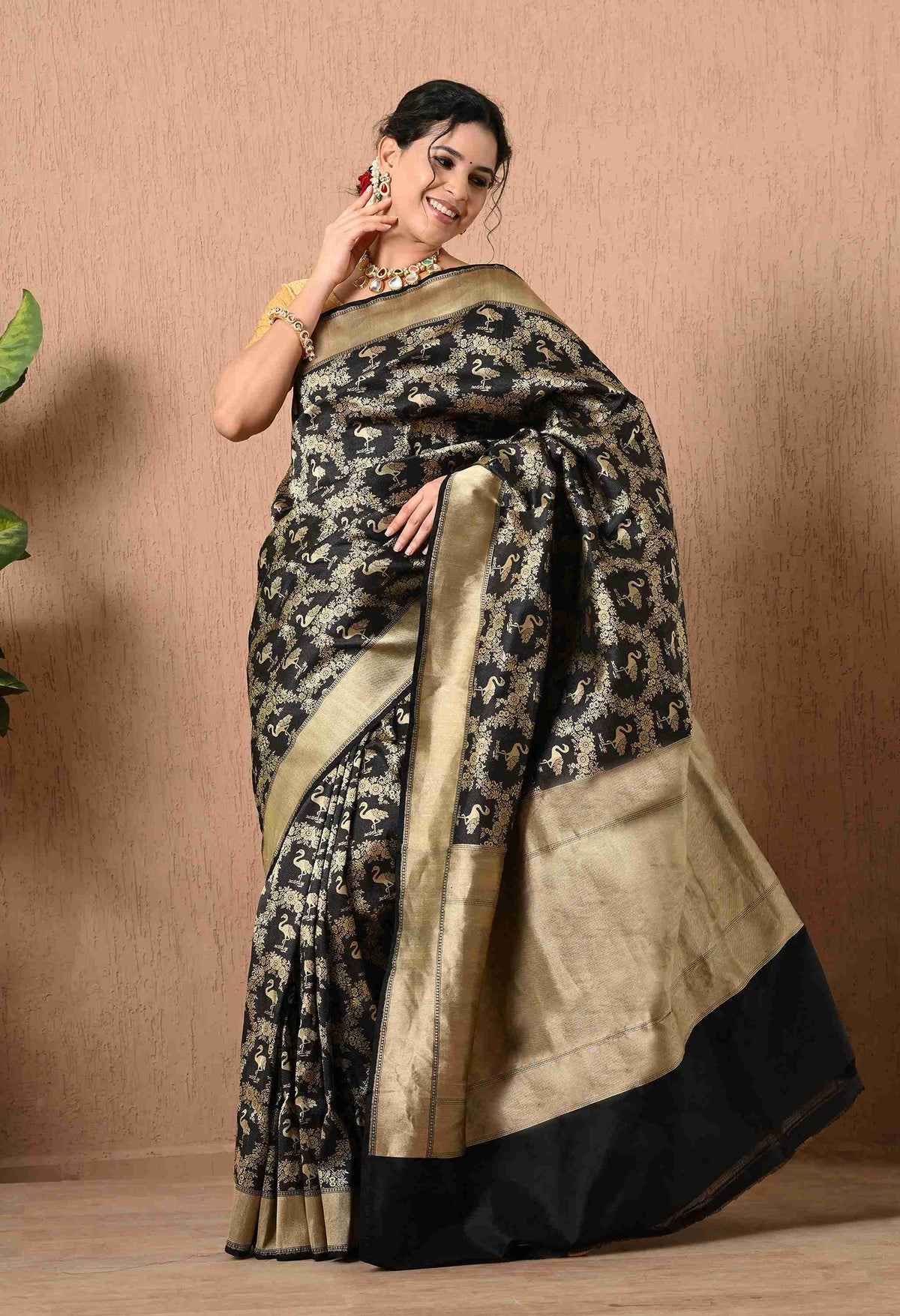 Welcome To Our The Weavers Shop By Raavi, It is a heritage, Pure Kataan Silk Black Saree with Gold Hand Zari Weave in Shikargah Design hold a special place in India's rich textile legacy, once worn by queens and virtue as a symbol of grandeur and prestige. Known for their luxurious texture and timeless appeal, this saree have been treasured for generations. The most beautiful Shikargah design, intricately woven with handcrafted gold zari, narrates tales of royal hunts and heritage, making each saree a true masterpiece of tradition and artistry. Its design, beauty, elegance, and charm is unmatchable. Let your wardrobe be as luxurious as the history of Banarasi silk. Each of genuine hand woven banarasi sarees is worth your wardrobe.