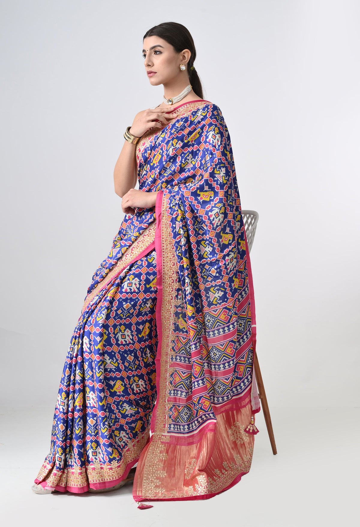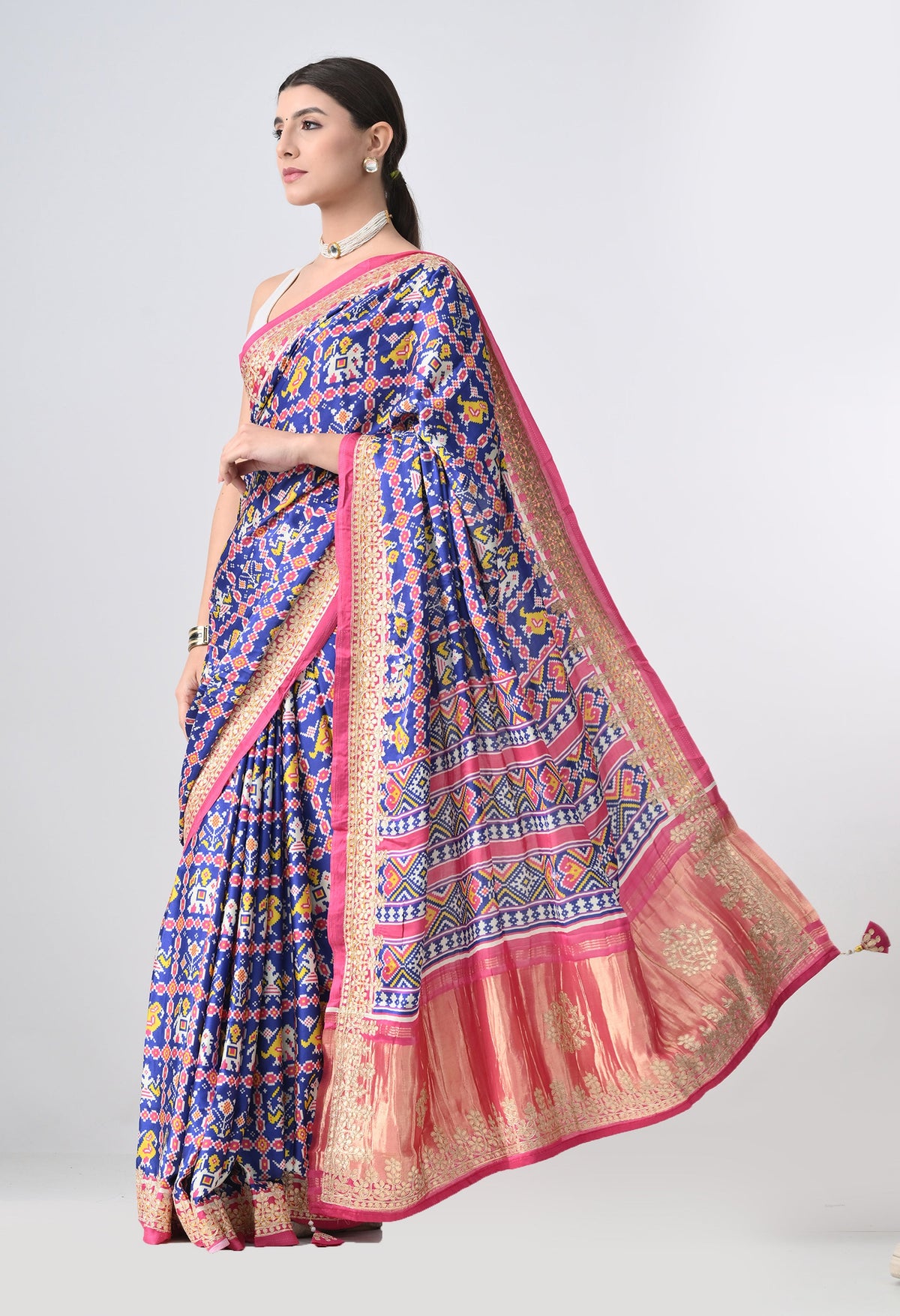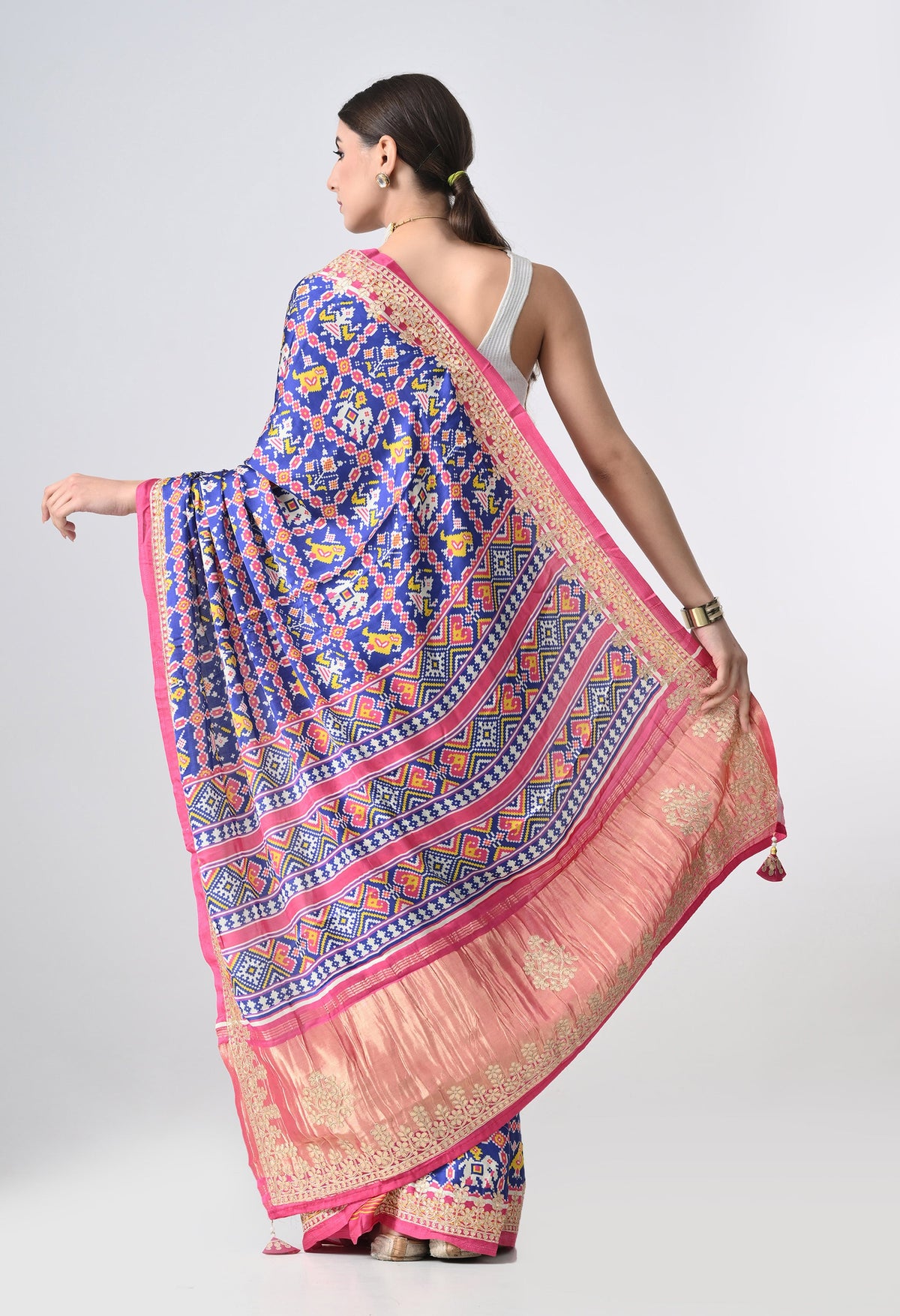 Welcome To Our The Weavers Shop By Raavi, with our beautiful Gajji Silk Saree, featuring a stunning multicolor palette. This luxurious fabric is adorned with intricate Ikkat prints. The Gajji silk fabric offers a luxurious texture and smooth drape, making it perfect for festive occasions and celebrations. The saree is beautifully adorned with intricate Gotta Patti work along the border, adding a touch of shimmer and elegance. The Patola digital print further enhances the look with vibrant colors and bold patterns, creating a modern twist on classic Indian artistry. This saree is a perfect blend of heritage and style, offering both comfort and grandeur.