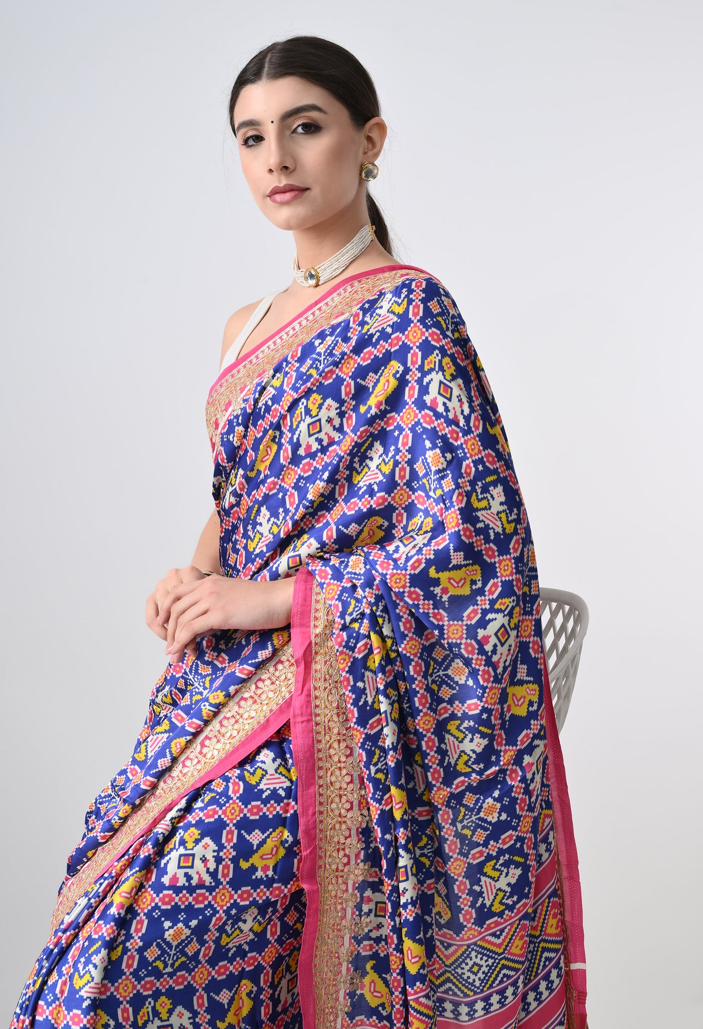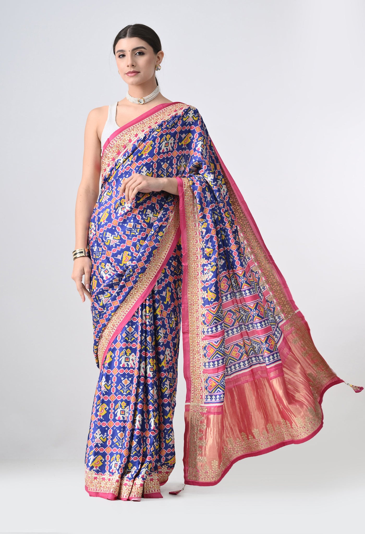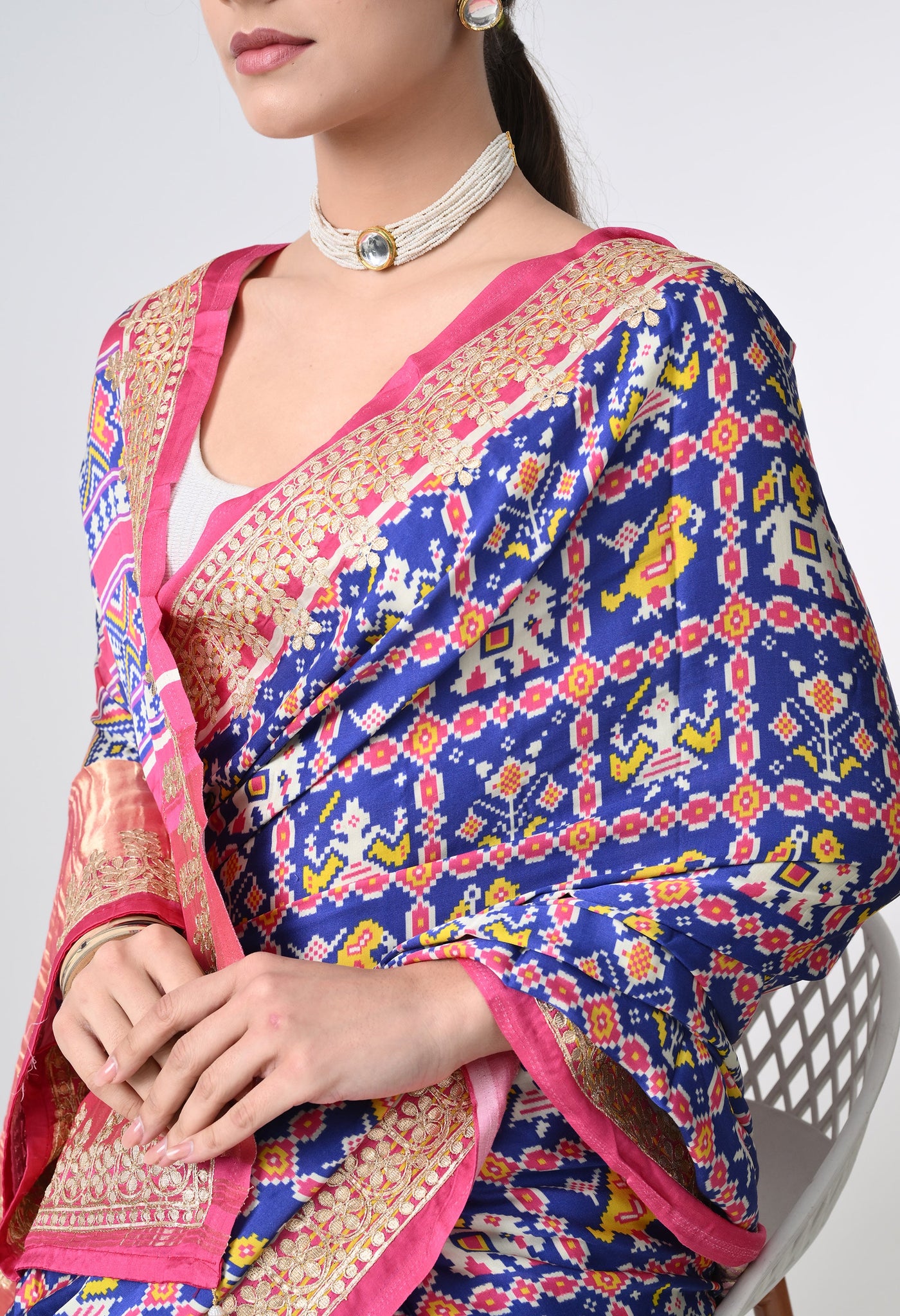Welcome To Our The Weavers Shop By Raavi, with our beautiful Gajji Silk Saree, featuring a stunning multicolor palette. This luxurious fabric is adorned with intricate Ikkat prints. The Gajji silk fabric offers a luxurious texture and smooth drape, making it perfect for festive occasions and celebrations. The saree is beautifully adorned with intricate Gotta Patti work along the border, adding a touch of shimmer and elegance. The Patola digital print further enhances the look with vibrant colors and bold patterns, creating a modern twist on classic Indian artistry. This saree is a perfect blend of heritage and style, offering both comfort and grandeur.