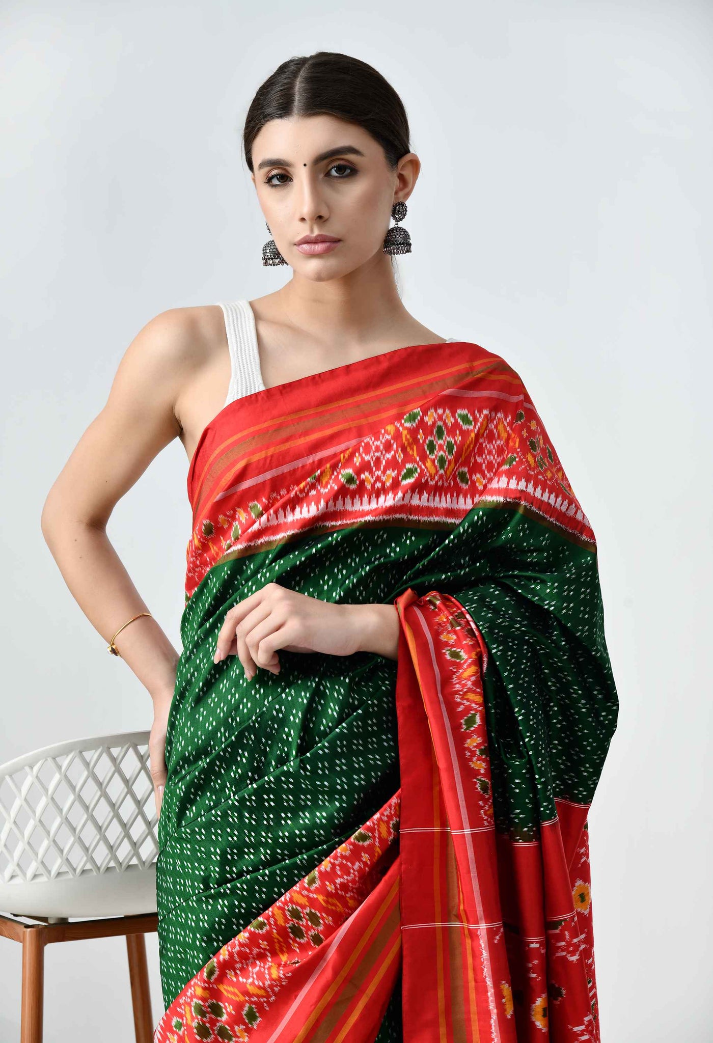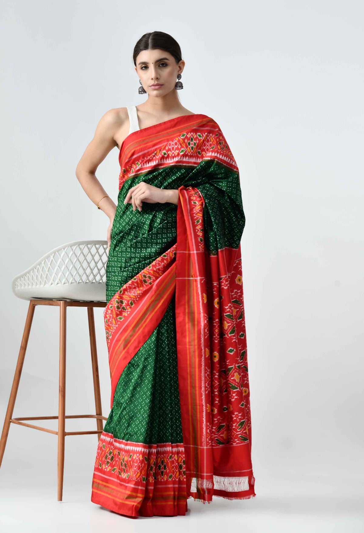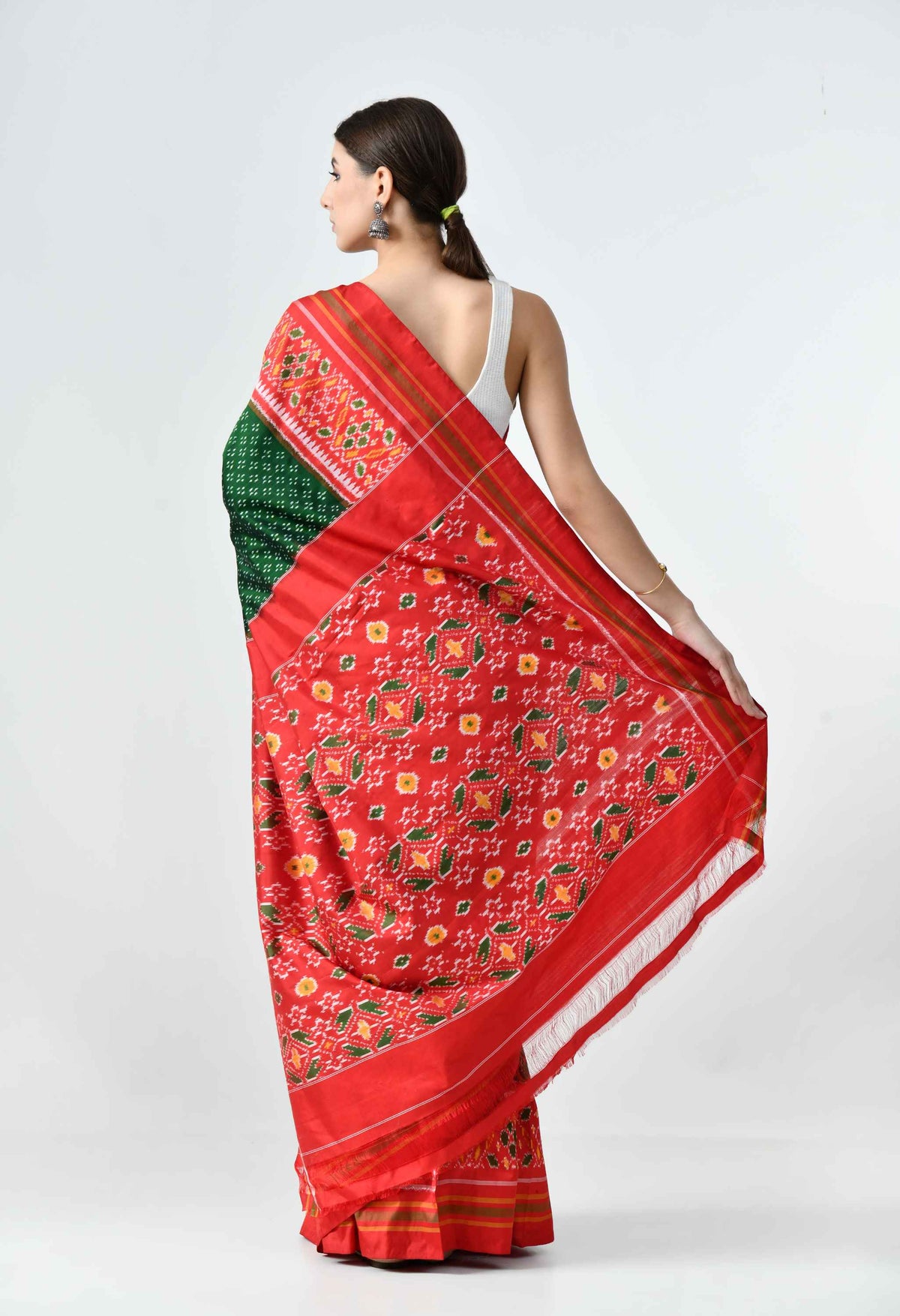 Welcome To Our The Weavers Shop By Raavi, This Classic Handloom Mulberry Silk Ikkat Saree has a unique Patola pattern. The elegant weave comes with Gold Zari border. The strikingly pretty pallu lends a gorgeous complement. The IIkat blouse adds oodles of panache. This green and red colors and beautiful designs make this saree a perfect choice for weddings, festivals, or grand occasions. and best for rakhi gifts for sister.