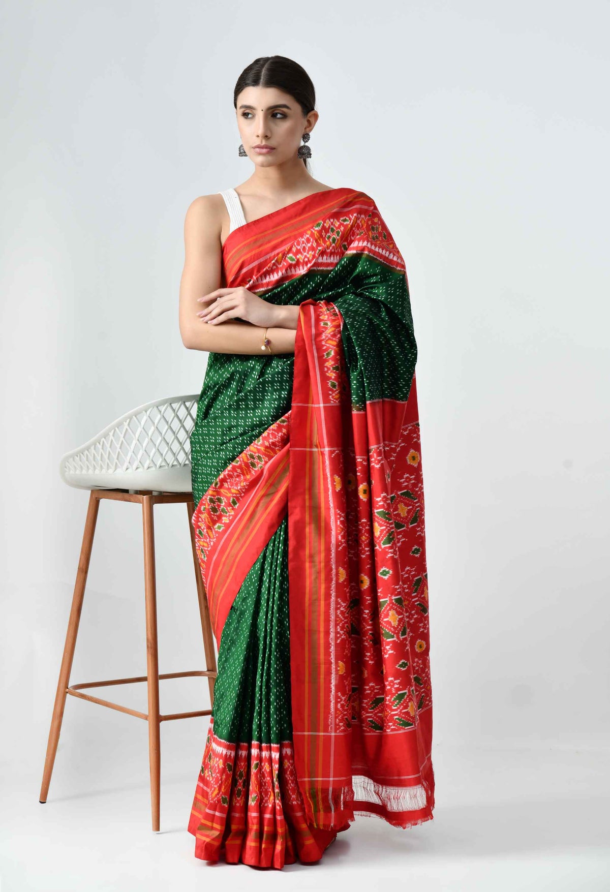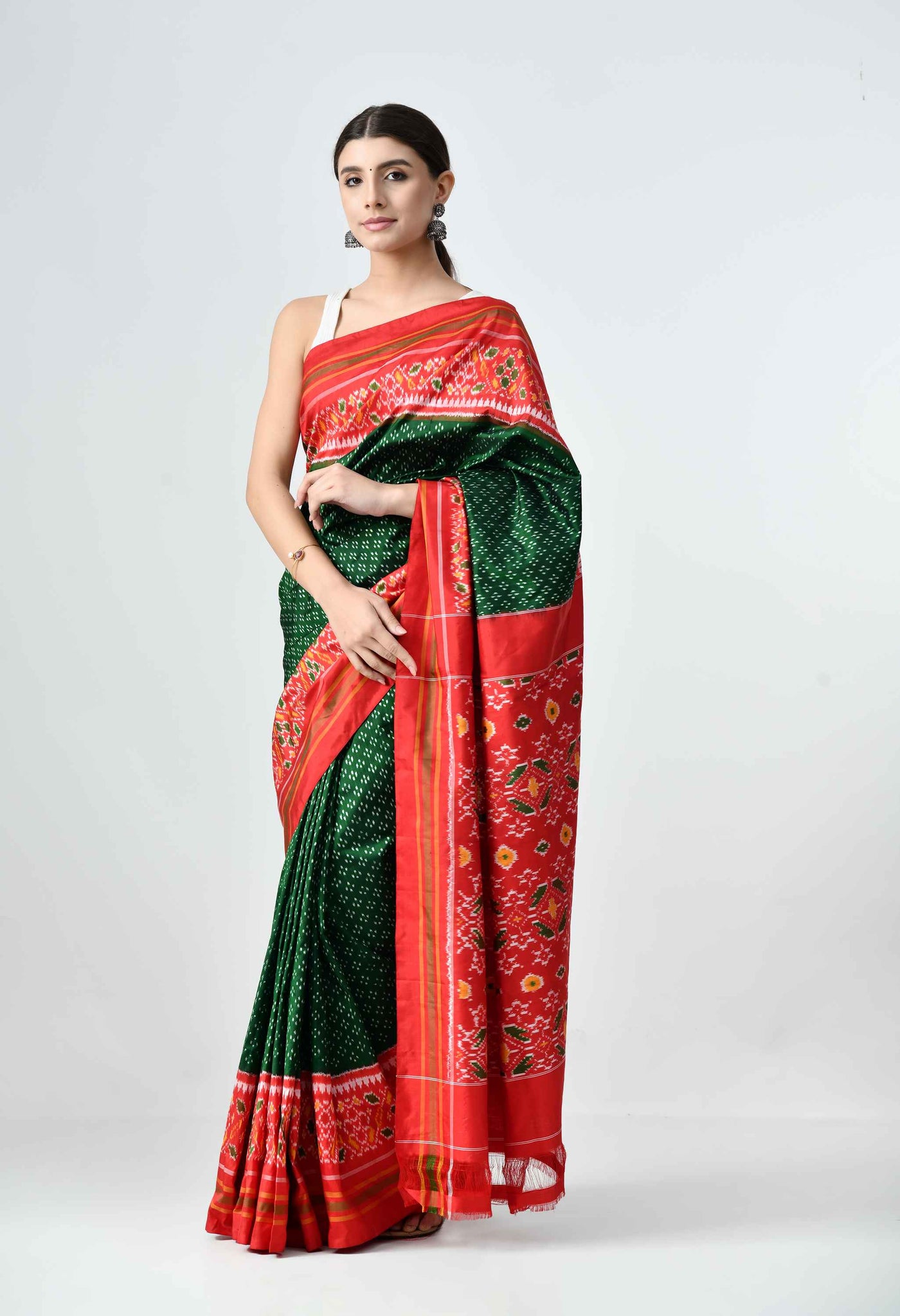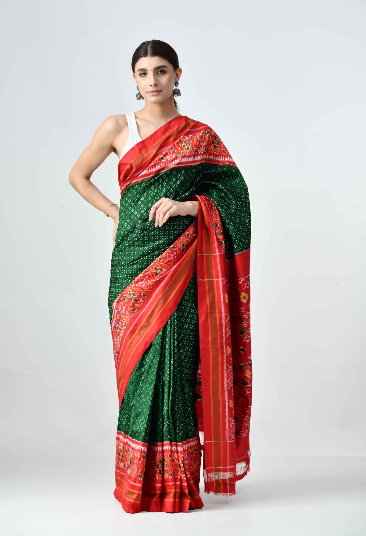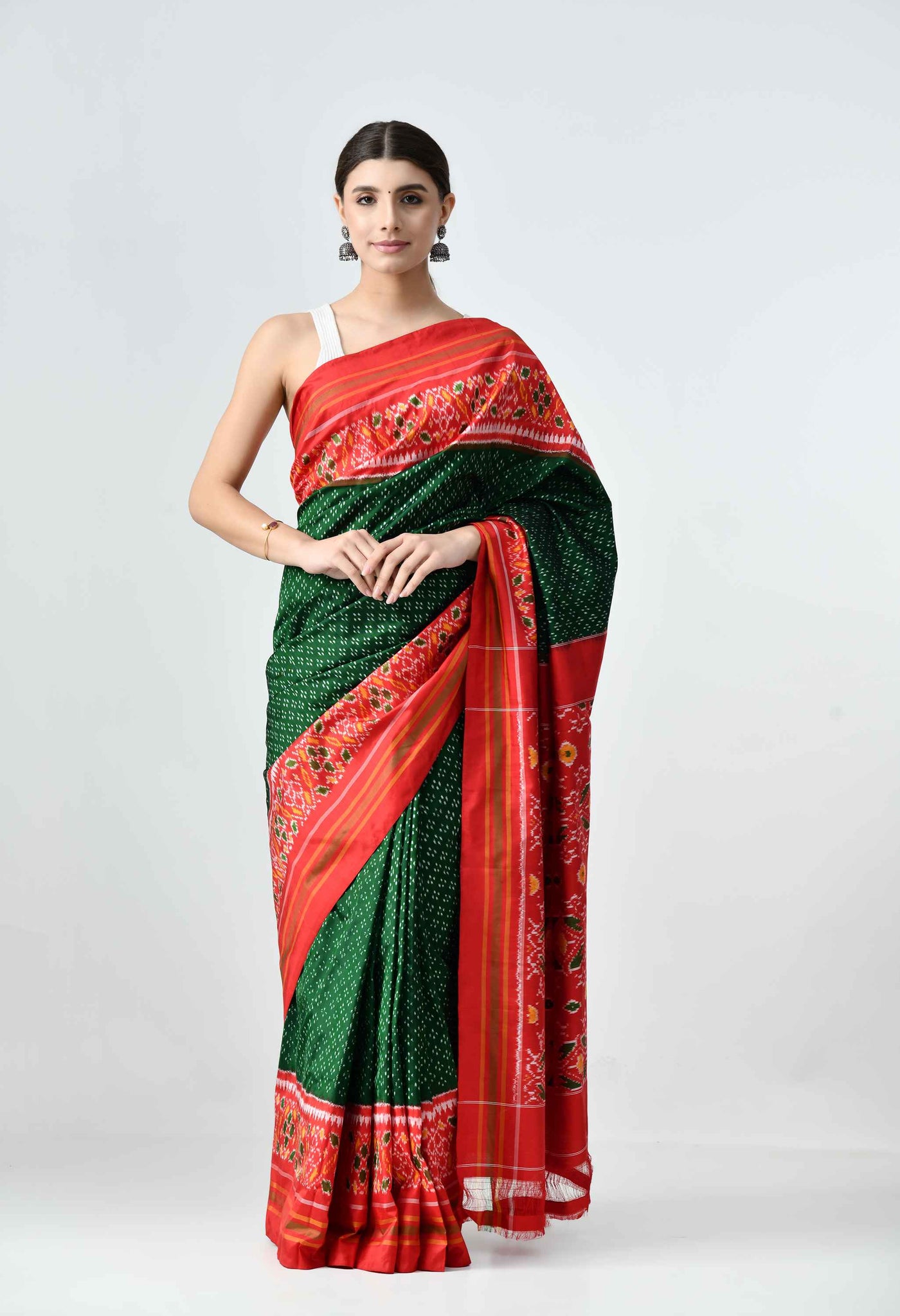 Welcome To Our The Weavers Shop By Raavi, This Classic Handloom Mulberry Silk Ikkat Saree has a unique Patola pattern. The elegant weave comes with Gold Zari border. The strikingly pretty pallu lends a gorgeous complement. The IIkat blouse adds oodles of panache. This green and red colors and beautiful designs make this saree a perfect choice for weddings, festivals, or grand occasions. and best for rakhi gifts for sister.