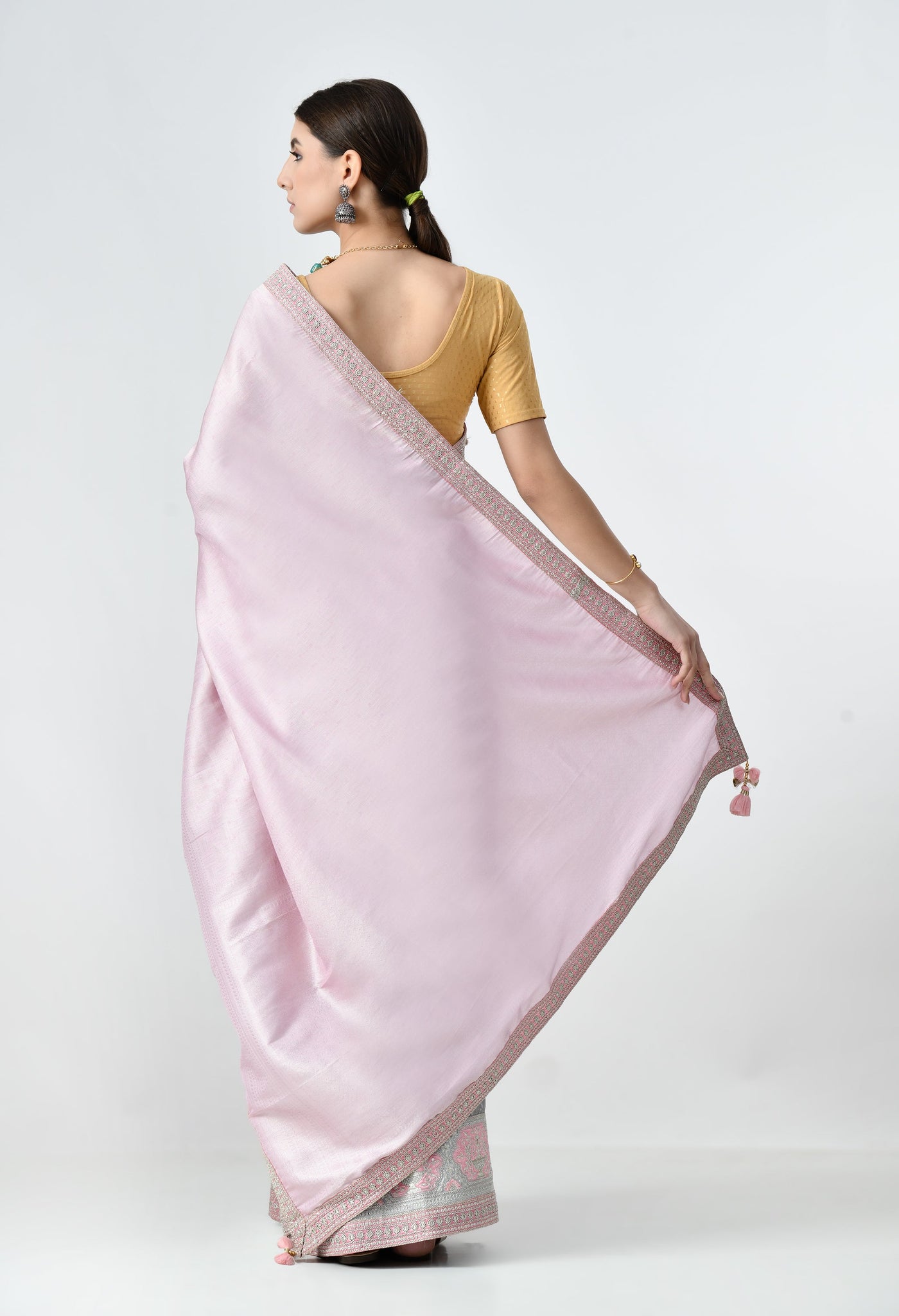 Welcome to The Weavers Shop By Raavi, With this graceful Satin Silk Saree, crafted in a stunning combination of soft pink and elegant silver accents. The smooth texture and natural sheen of satin silk give the fabric a luxurious and polished appearance, while the delicate silver embellishments add a subtle sparkle that complements the overall softness of the pink base.