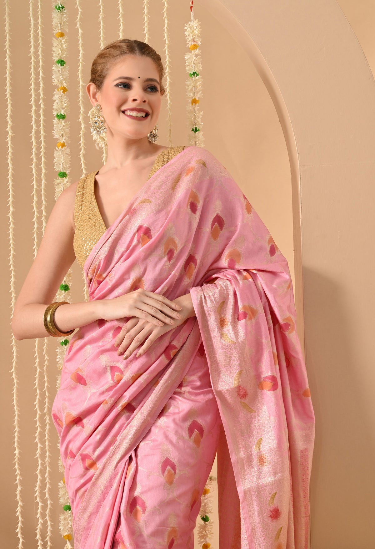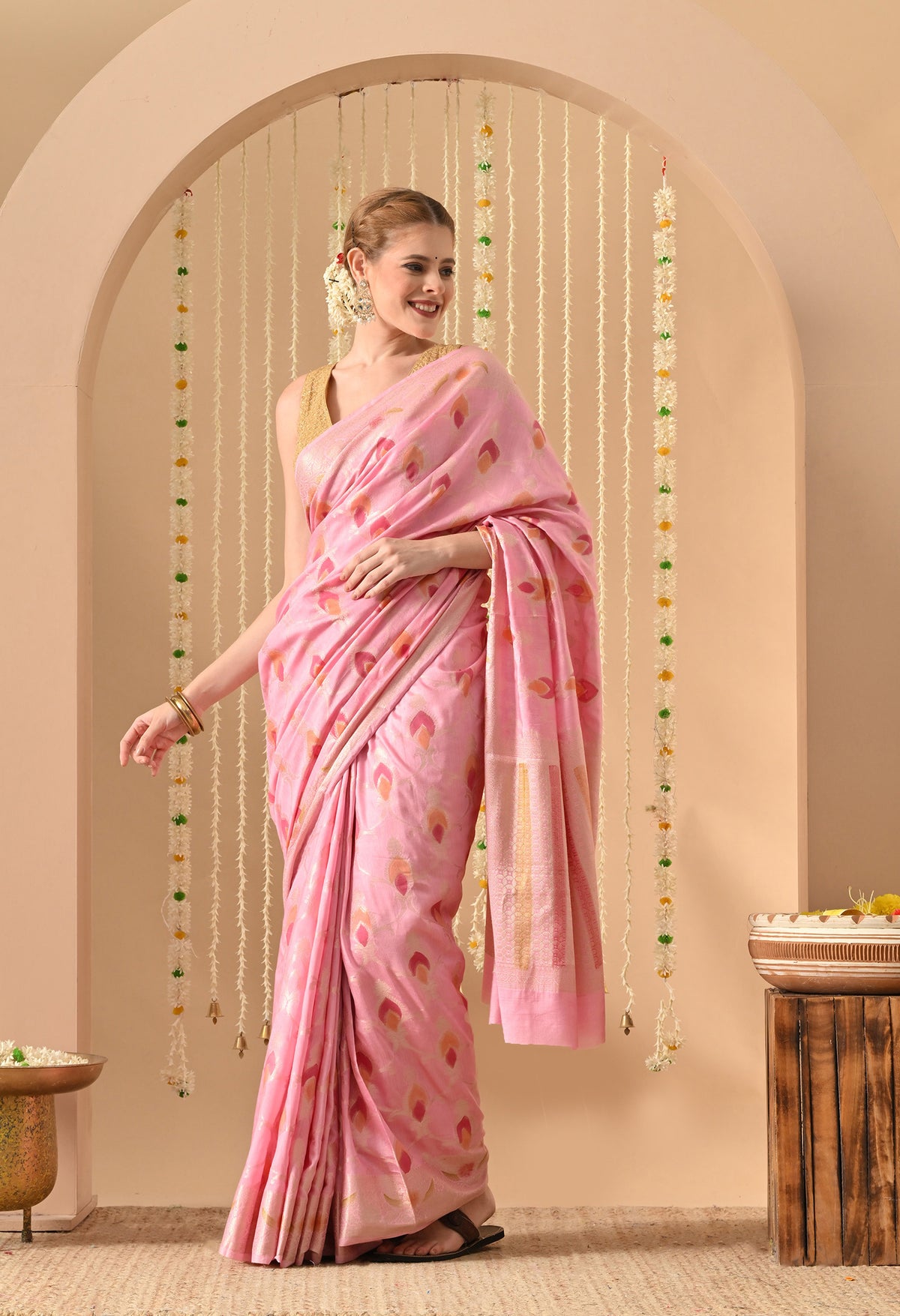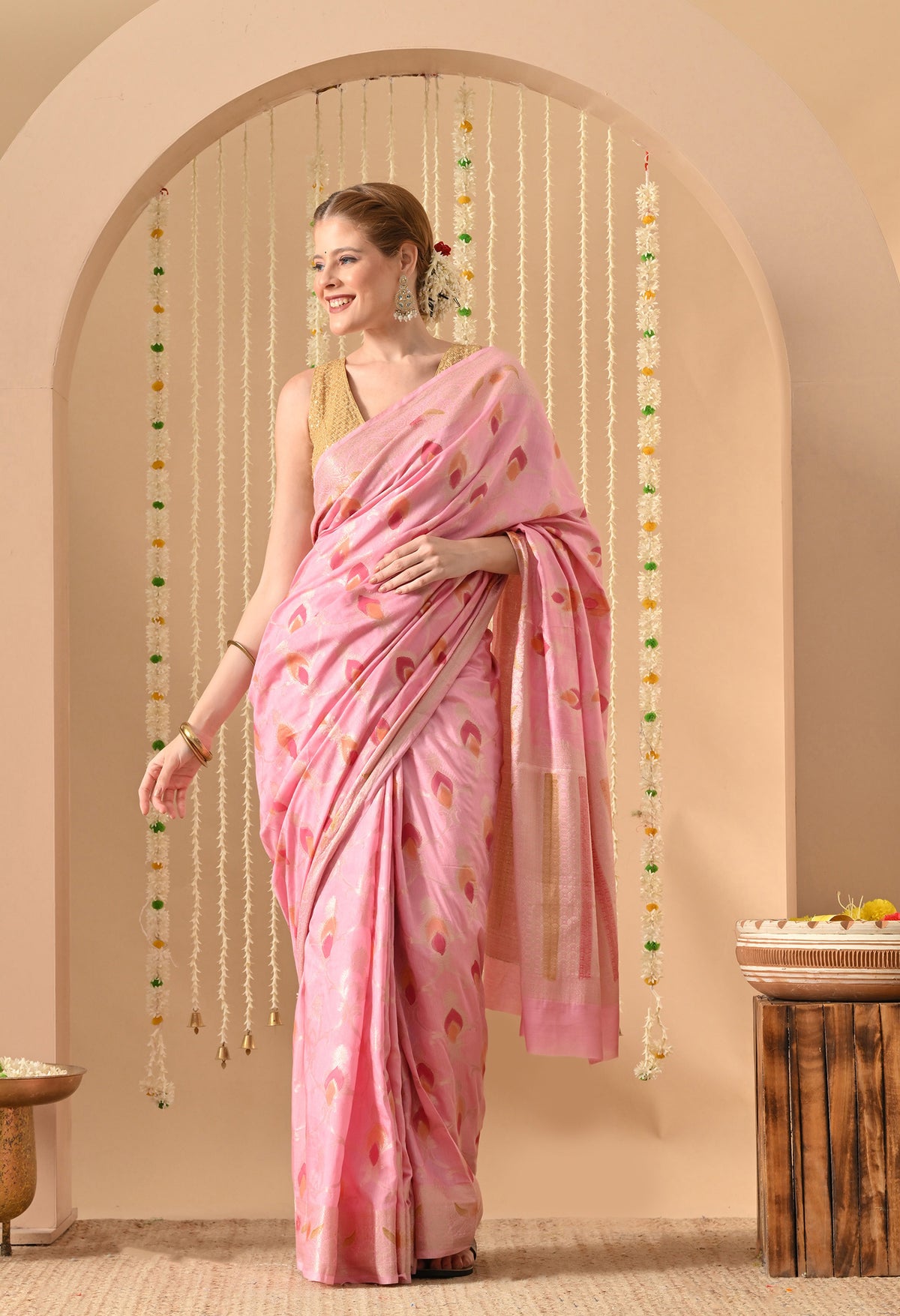 Welcome to The Weavers Shop. we bring you timeless craftsmanship in the form of our Silk Pink Saree with Tilphi Zari work, a masterpiece that celebrates heritage and elegance. Woven from the finest silk, this saree offers a luxurious drape, soft texture, and a natural sheen that exudes sophistication. Perfect for weddings, festive occasions, and grand celebrations, this saree is a statement piece for every ethnic wardrobe.