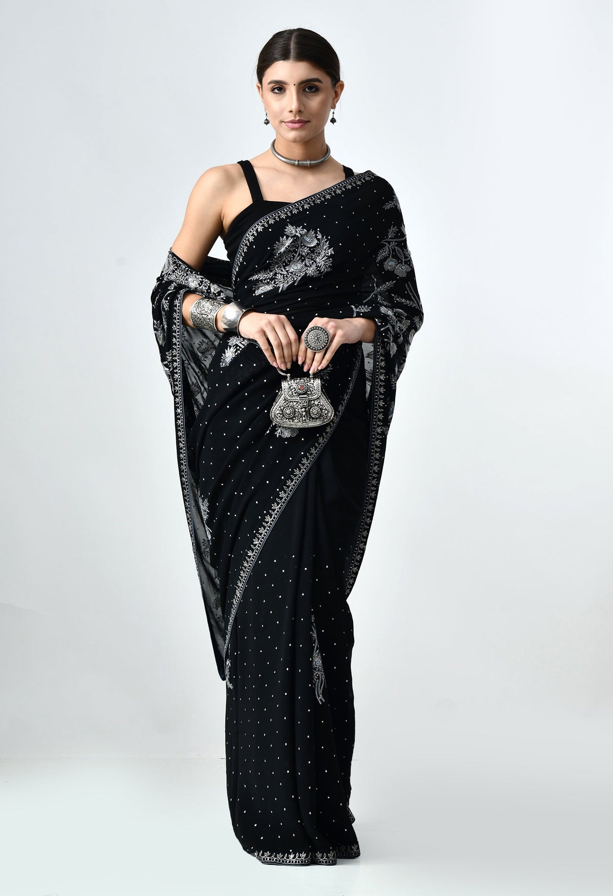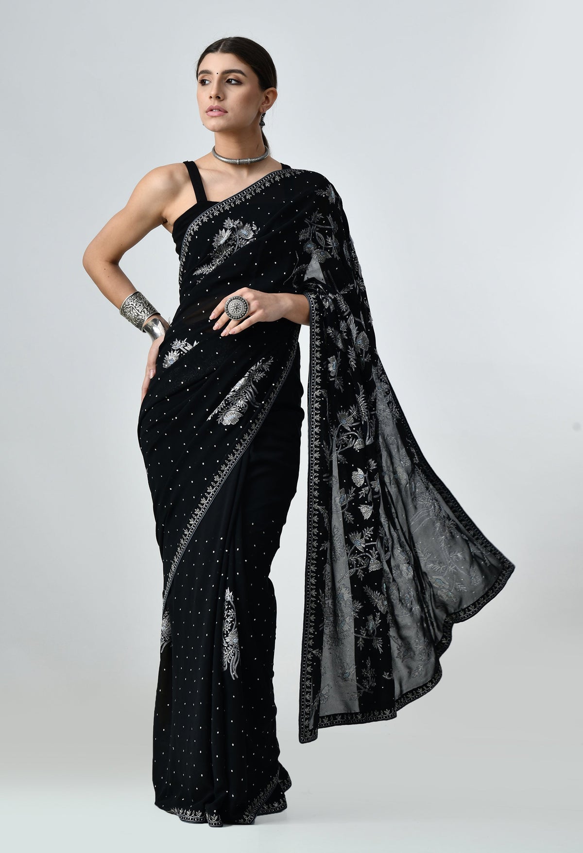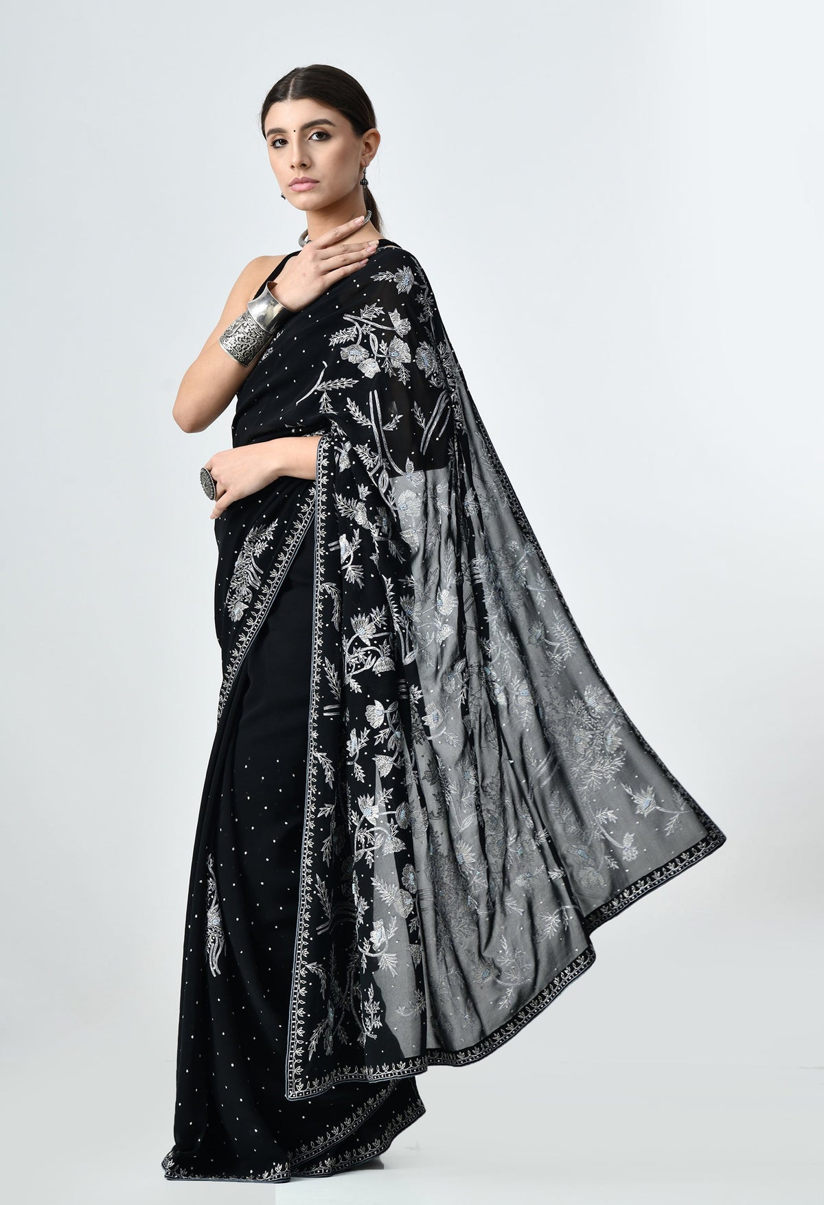 Welcome To Our The Weavers Shop by Raavi, with this Black Pure Georgette Saree, exquisitely adorned with Kasab Jaal Kashmiri Tilla embroidery. Crafted from lightweight and fluid pure georgette, this saree offers an effortless drape, sheer elegance, and graceful movement perfect for weddings, festive evenings, and traditional celebrations.
