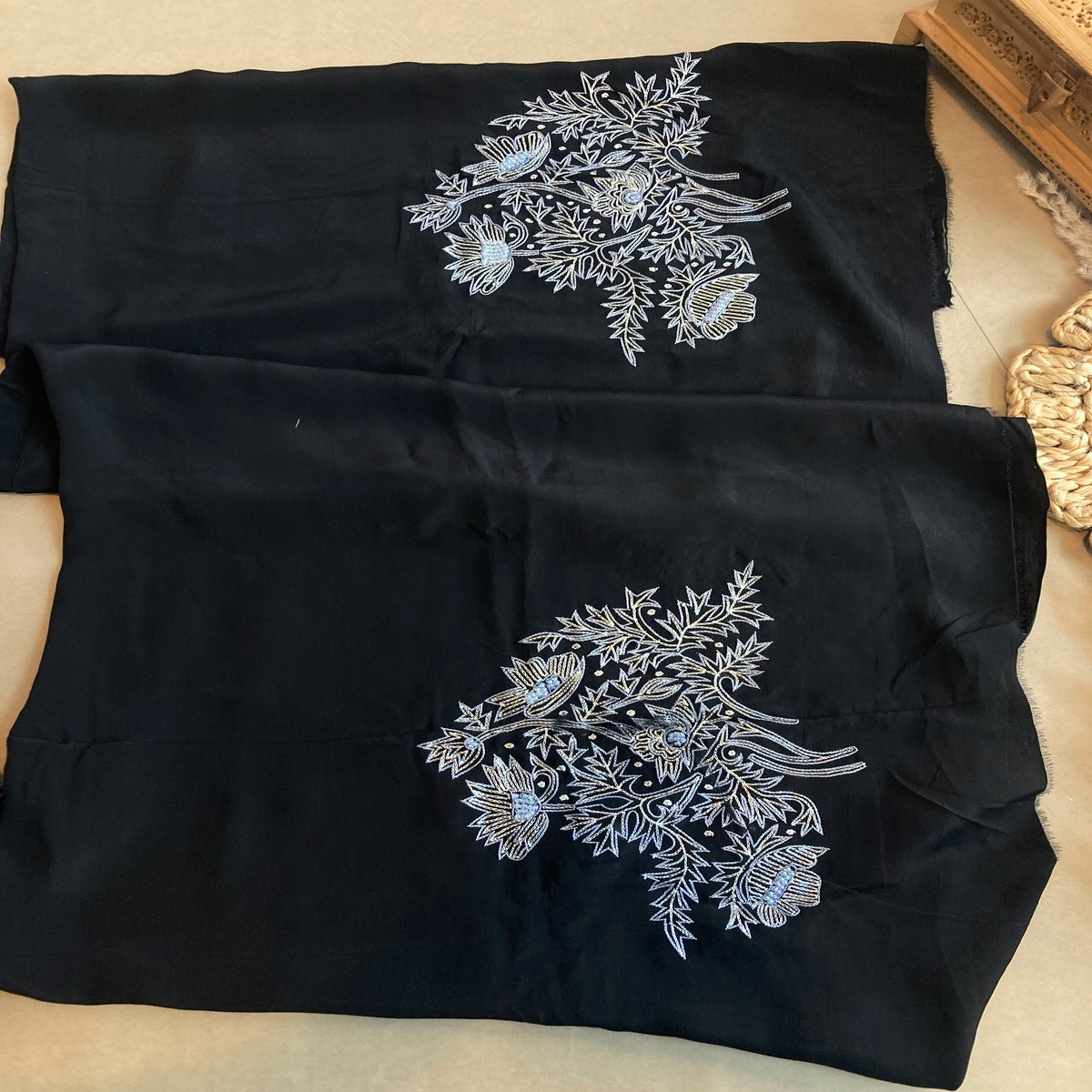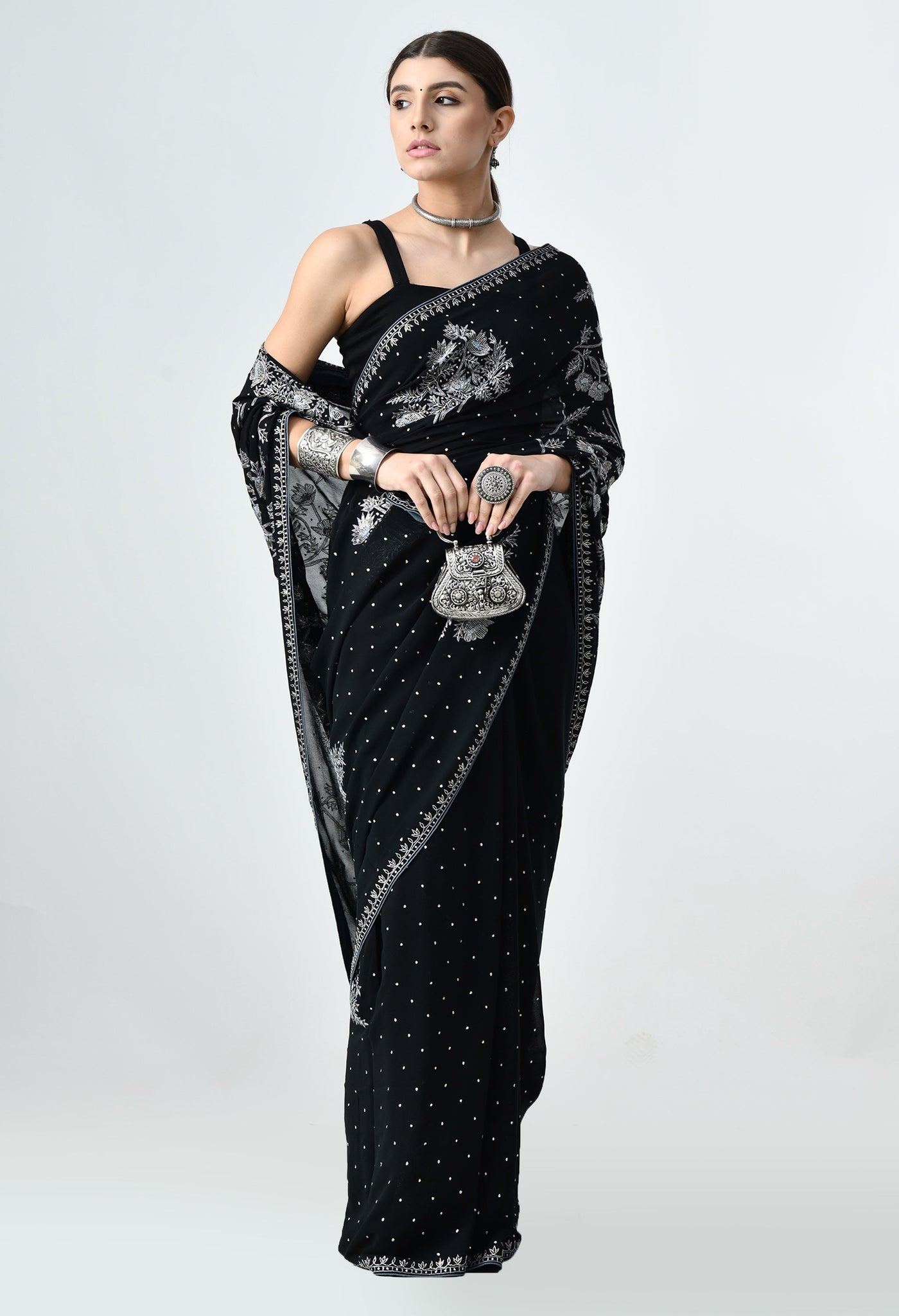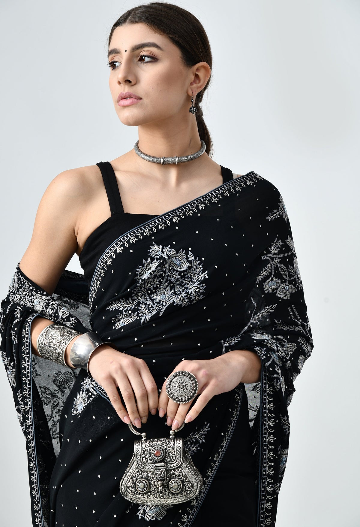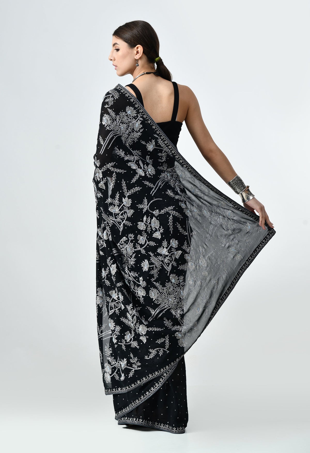 Welcome To Our The Weavers Shop by Raavi, with this Black Pure Georgette Saree, exquisitely adorned with Kasab Jaal Kashmiri Tilla embroidery. Crafted from lightweight and fluid pure georgette, this saree offers an effortless drape, sheer elegance, and graceful movement perfect for weddings, festive evenings, and traditional celebrations.