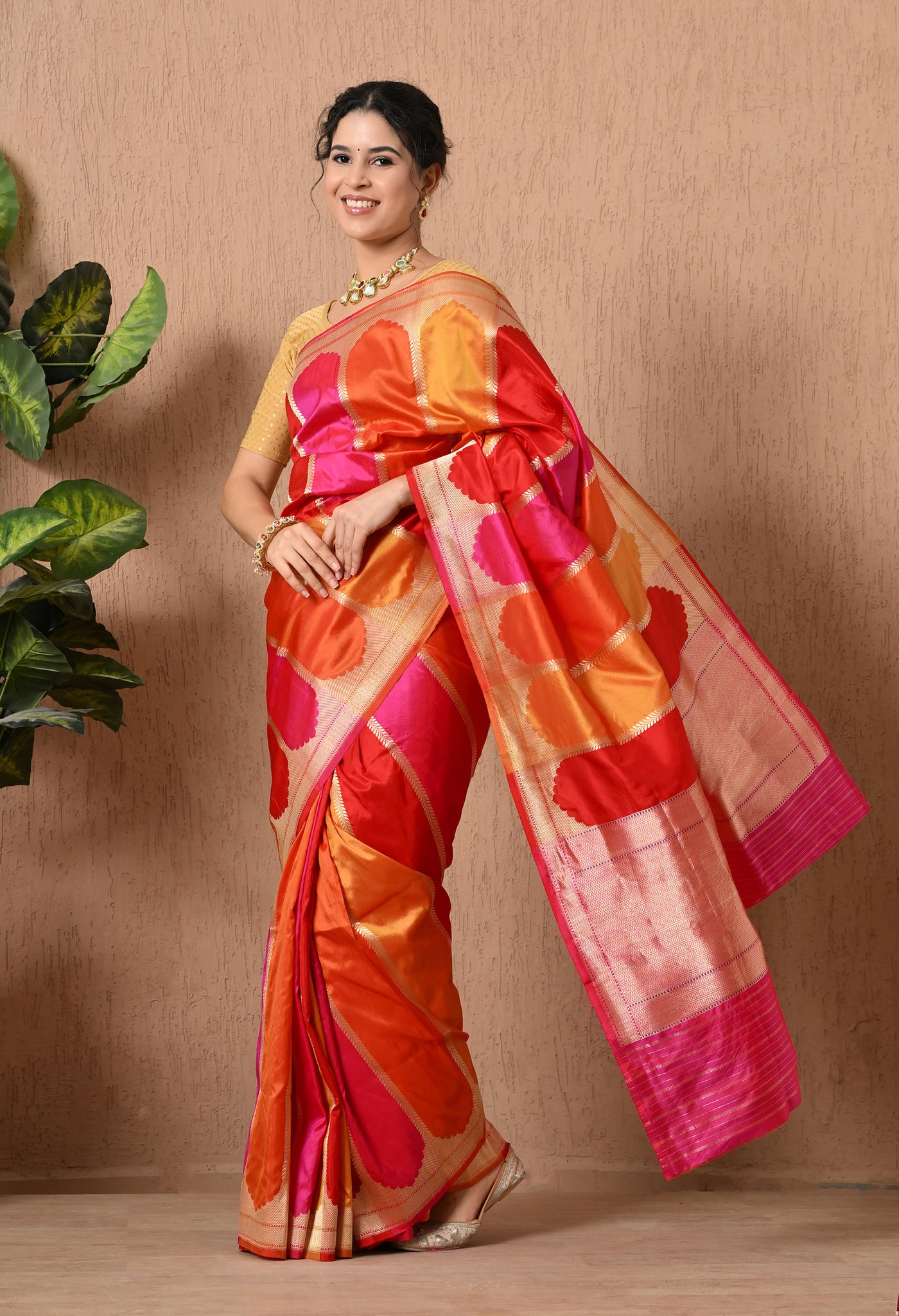 Welcome To Our The Weavers Shop By Raavi, Our luxurious Pure Banarasi Katan Silk Rangkat Saree in a regal multicolor hues. This masterpiece features beautiful Rangkat hand weaving technique, seamlessly blending shades to create a captivating play of tones. Crafted from the finest Katan silk, this saree is adorned with intricate zari hand weave accents, showcasing the unparalleled artistry of Banarasi craftsmanship. This deep multicolor, paired with its luxurious texture and subtle shimmer, makes this saree a perfect choice for weddings, festive celebrations, and grand occasions.