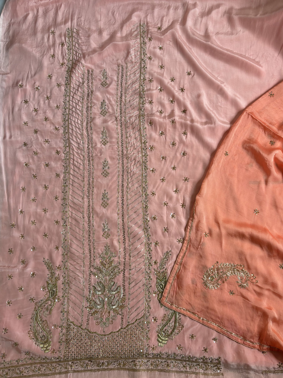 Welcome To Our The Weavers Shop By Raavi, with this stunning peach-colored suit set, designed to make every occasion unforgettable. The beautifully crafted Crepe Kurta is a blend of comfort and luxury, offering a graceful silhouette that drapes effortlessly. Adorned with intricate Zardosi work, Cut Dana, and Tilla embroidery, the ensemble radiates opulence and sophistication. This luxurious Chiffon Dupatta adds a delicate flow to the look, featuring carefully placed embellishments that enhance its ethereal charm. The peach hue exudes warmth and femininity, making this suit set perfect for weddings, Party wear salwar suits for sister.
