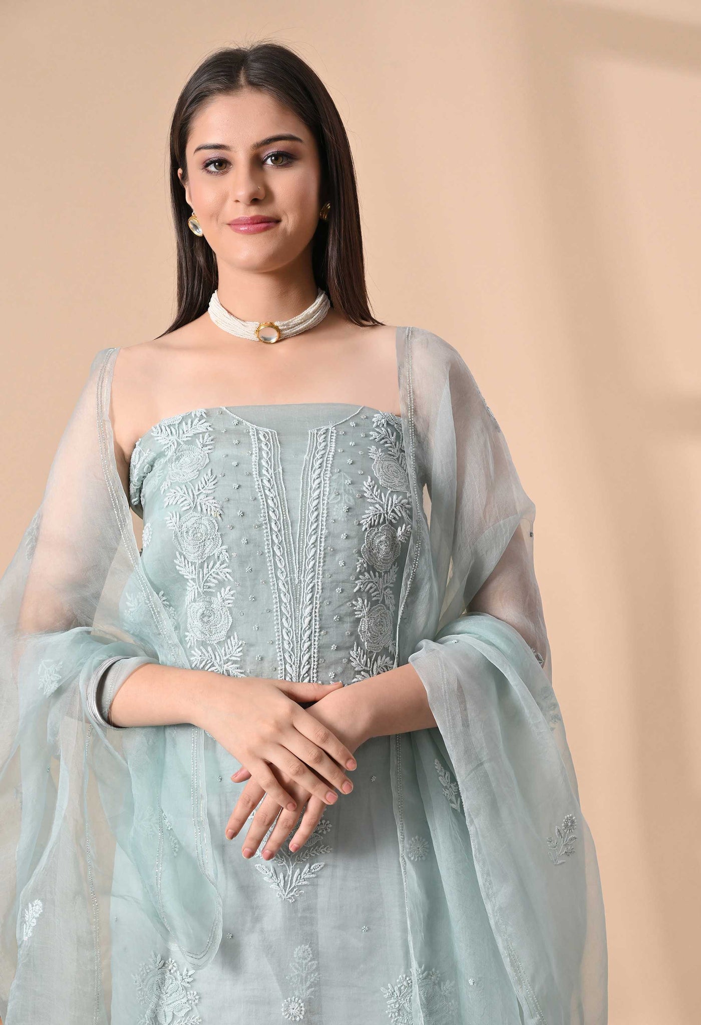 Welcome To Our The Weavers Shop By Raavi, Pure Organza chikankari Kurta Dupatta with cut dana work is a beautiful combination of delicate organza fabric and intricate chikankari embroidery. with this pure organza handloom suit set featuring intricate Chikankari hand embroidery and dazzling cut dana work. Perfect as a salwar suit for women, it exudes elegance and tradition, making it an ideal choice for women suits party wear and women suits for wedding. Designed for both formal and festive occasions, this designer salwar kameez for women adds a touch of luxury to any event. Whether you're seeking handloom suits or stylish women suits clothing, this piece blends tradition with contemporary style. A must have for those looking for women suits wedding or women suits formal attire.
