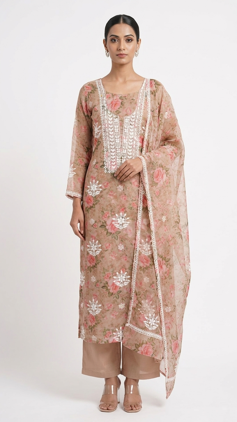 Women Dusty Pink & Rose Floral Printed Organza Unstitched Dress Material with White Chikankari-style Embroidery