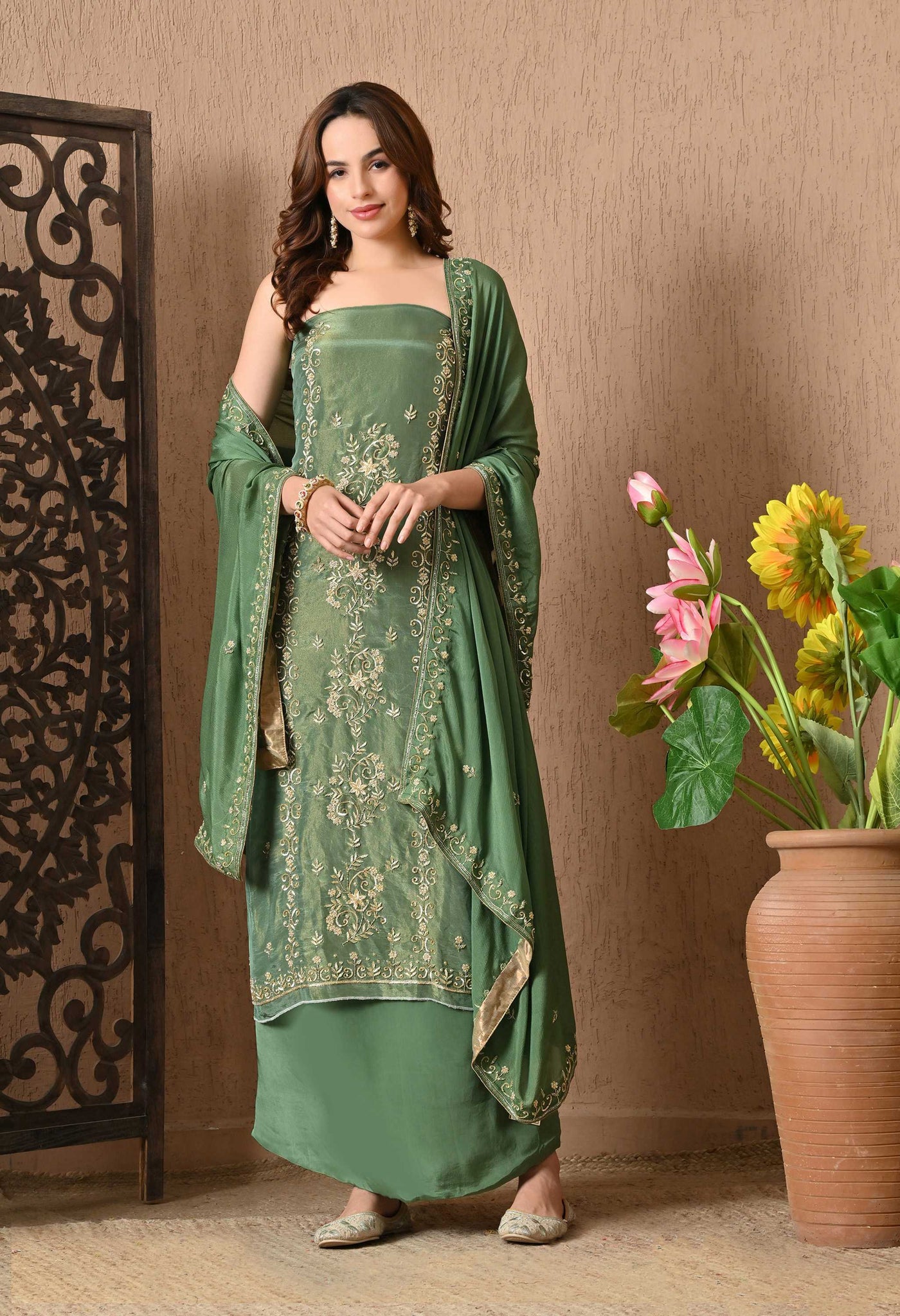 Welcome To Our The Weavers Shop By Raavi, with this stunning Simmer Organza Salwar Suit, exquisitely designed for women who appreciate the perfect blend of tradition and elegance. Crafted from luxurious organza fabric, this suit exudes a soft, shimmering glow, ideal for festive and special occasions. The ensemble includes a beautifully tailored salwar, designed to provide both comfort and sophistication. Its contemporary styling, combined with traditional craftsmanship, ensures you look stunning at every occasion. this salwar suit for women is a must have, offering a timeless, luxurious option for any festive celebration.