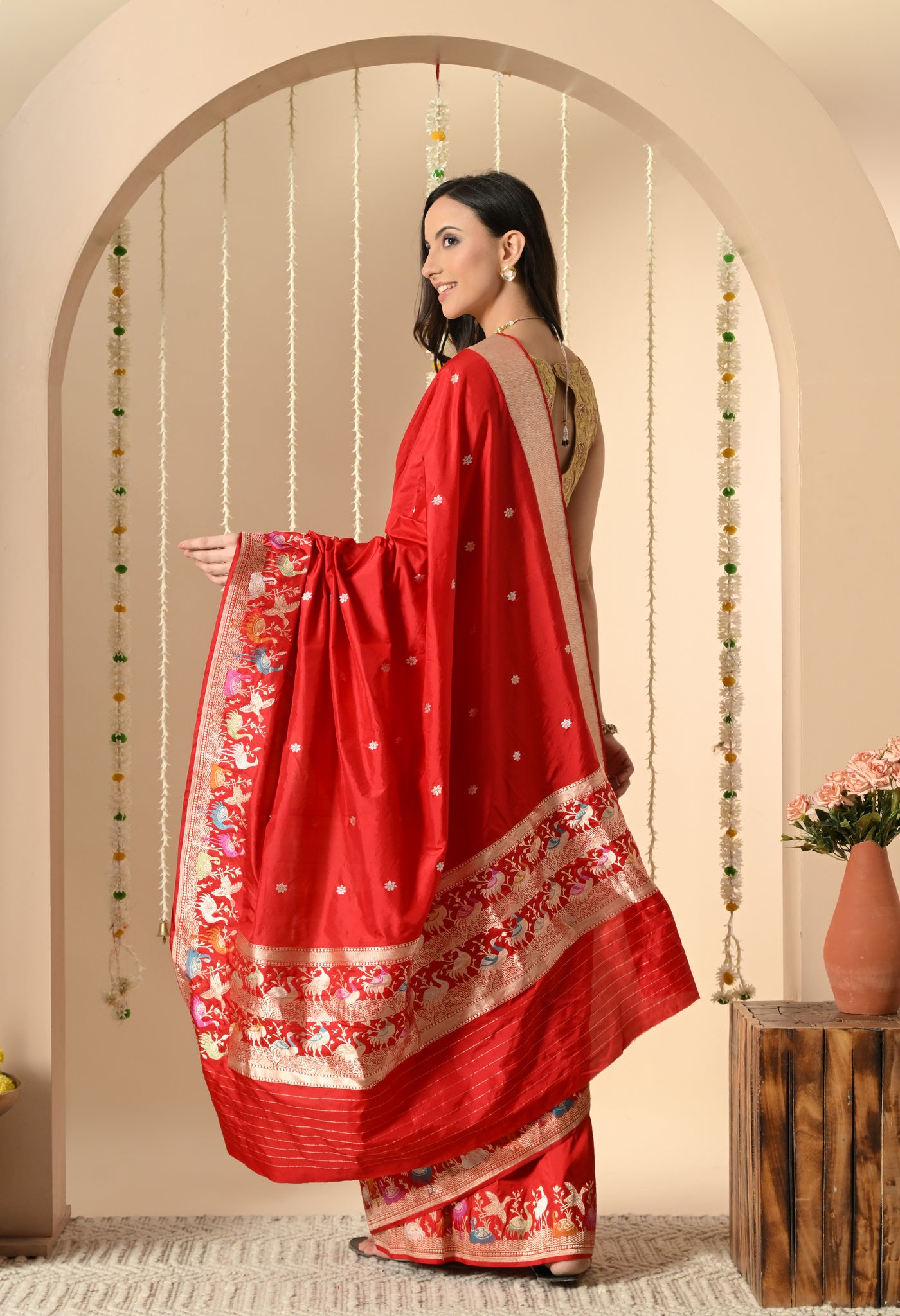 Welcome to The Weaver’s Shop. Experience the pinnacle of heritage craftsmanship with our Pure Katan Silk Saree, a masterpiece of traditional hand-weaving featuring the legendary Shikarga border. Masterfully adorned with intricate zari and crafted from the finest natural silk, this saree offers a regal sheen and a cultural narrative that makes it the definitive choice for weddings and grand celebrations.